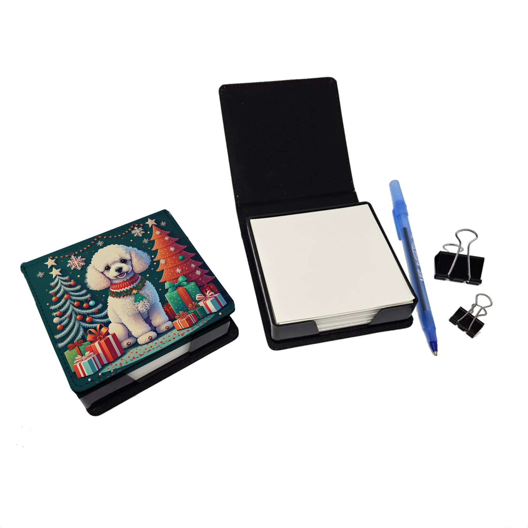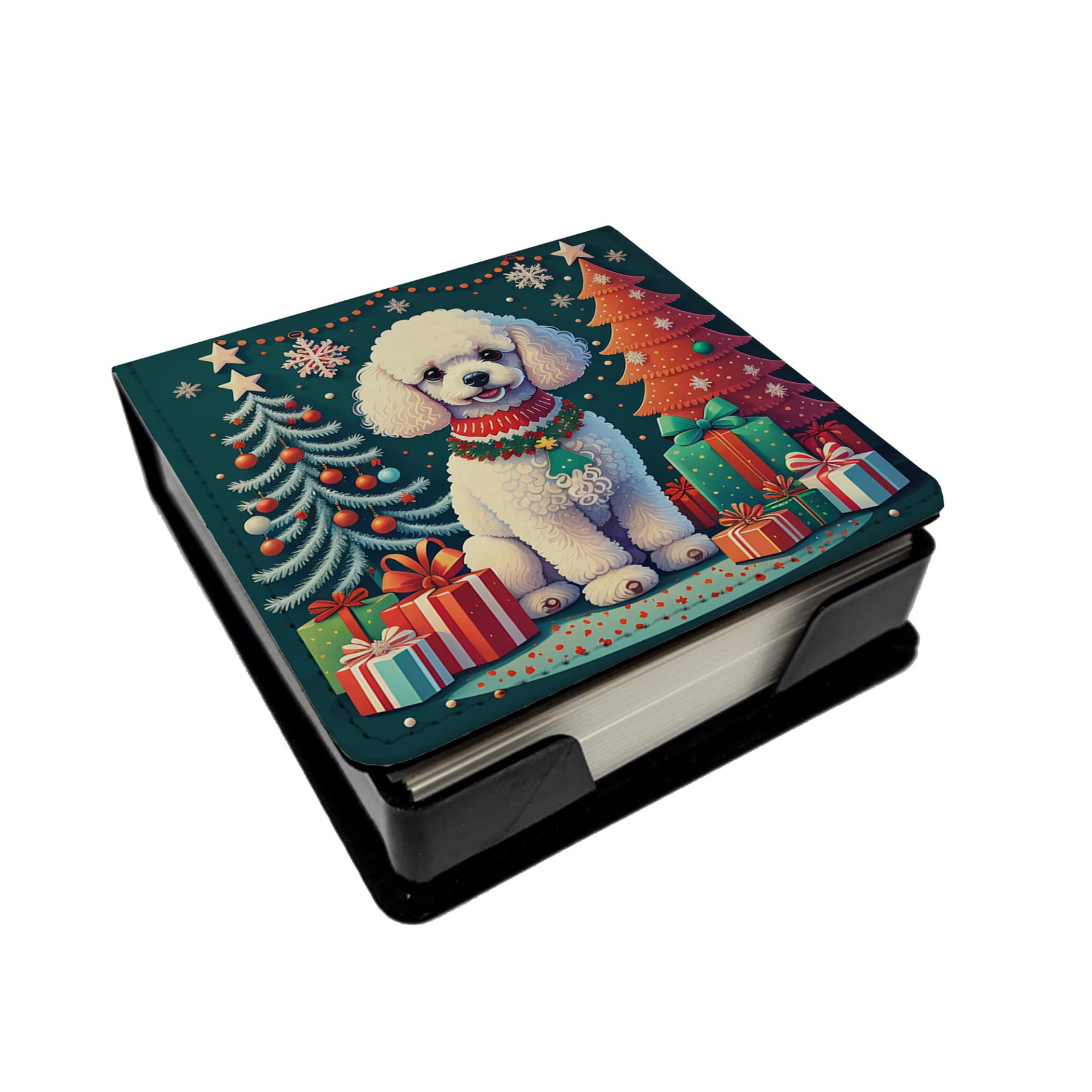 Transform Your Workspace: Elevate your desk with the White Toy Poodle Christmas PU Leather Note Paper Holder, featuring unique, breed-specific Poodle artwork. This sophisticated note holder is designed to offer both a premium aesthetic and a commitment to eco-friendly materials.