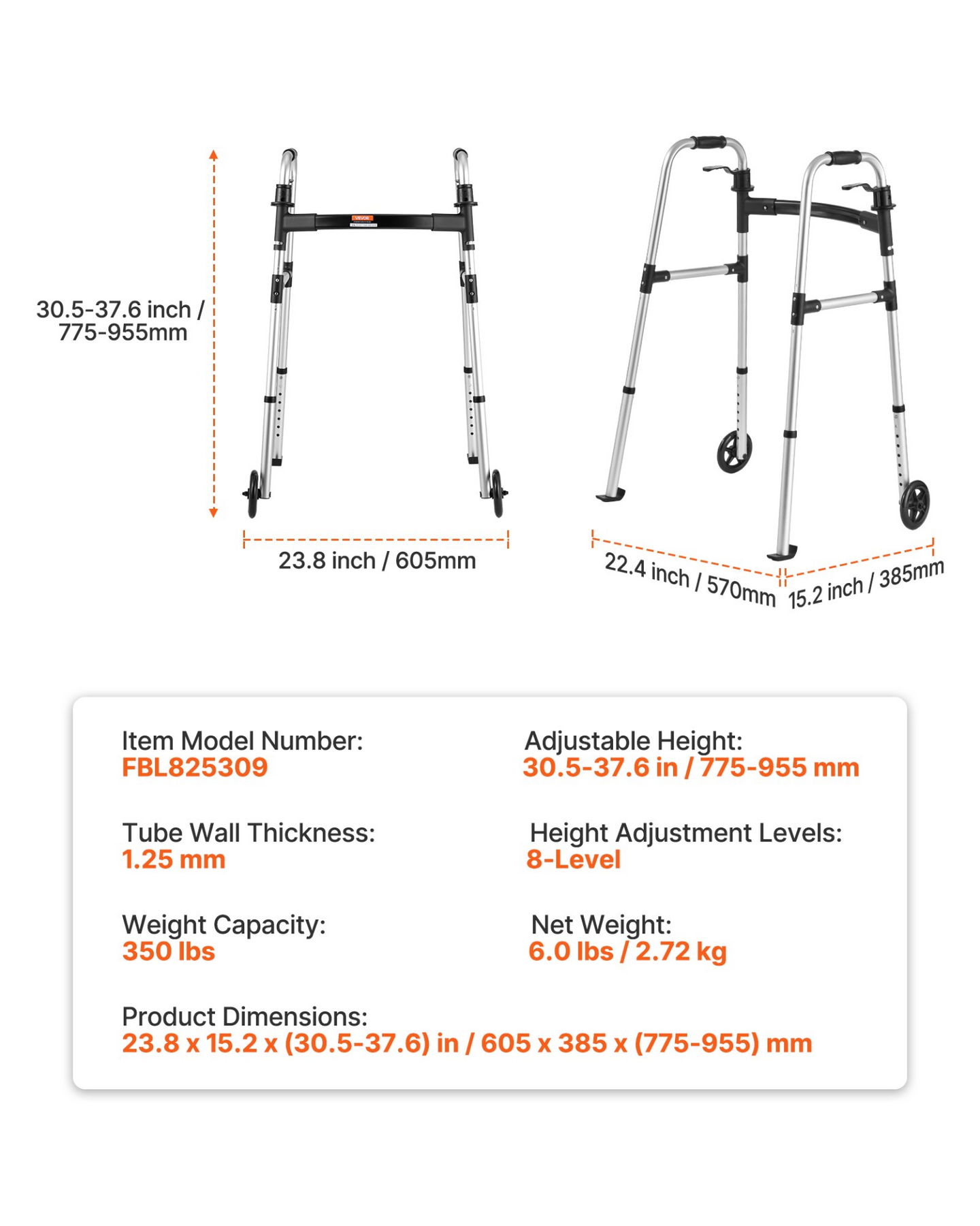 VEVOR Folding Walker, 2-Button Foldable Walker with 5" Wheels & 8-Level Adjustable Height, 350LBS Loading Lightweight Aluminum Mobility Walking Aid, Front-Wheeled Rolling Walkers for Seniors Adults