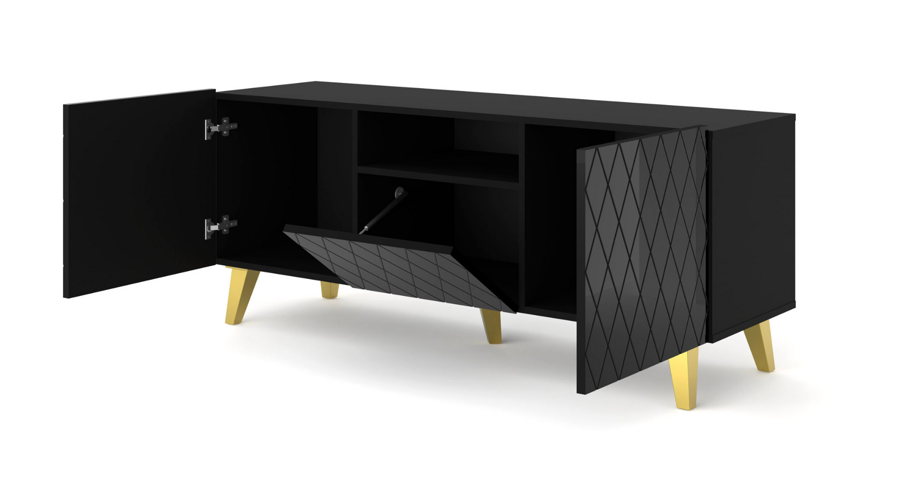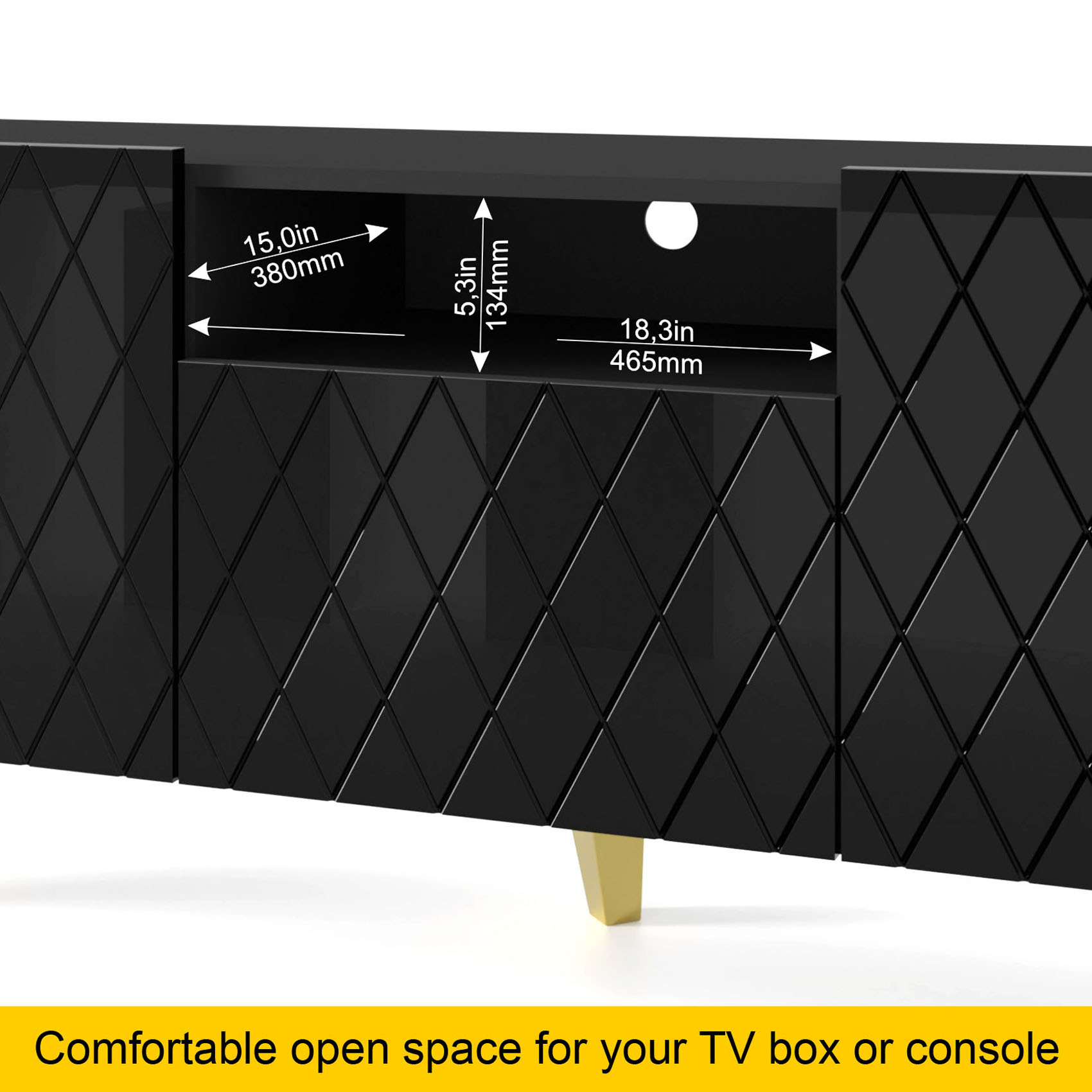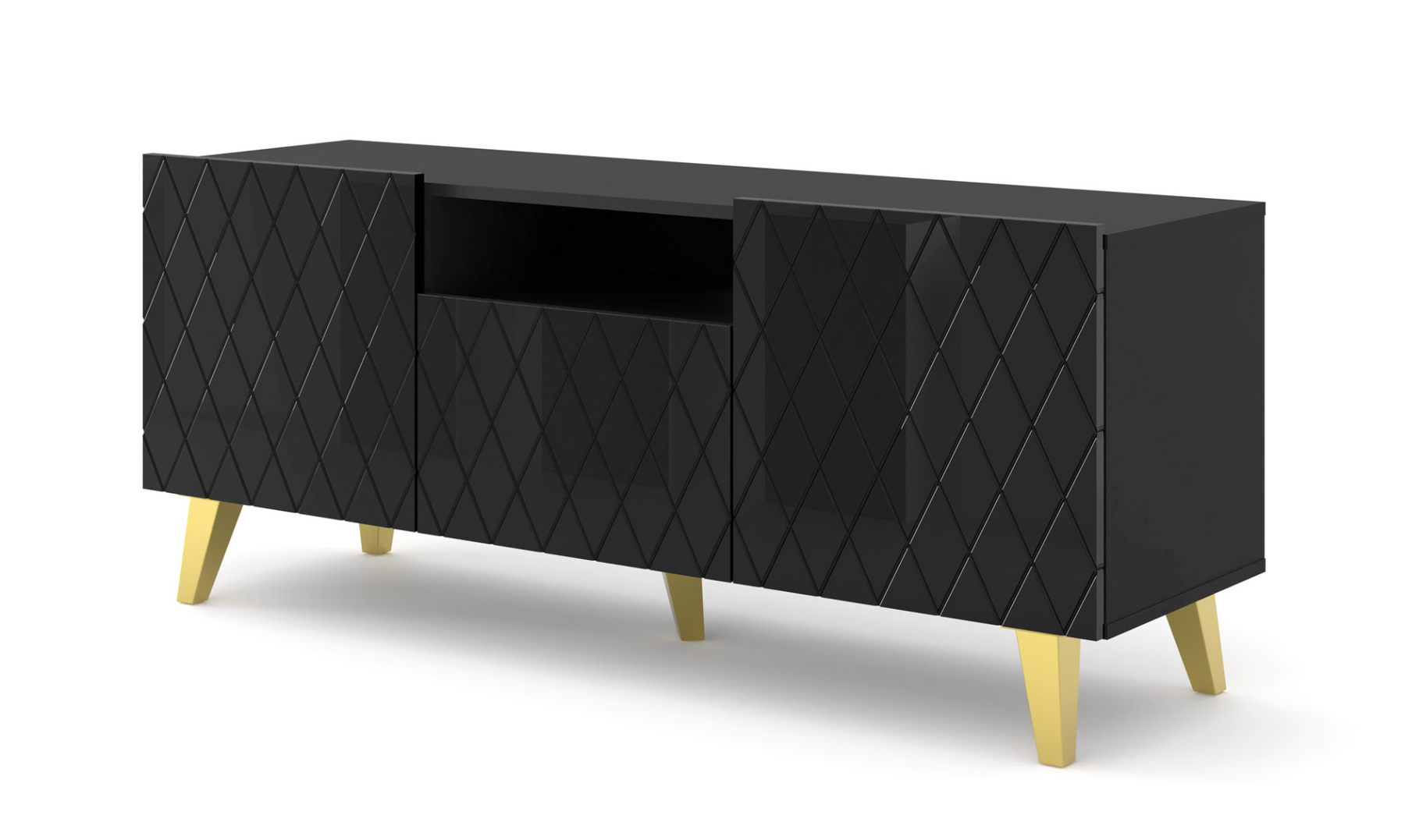 Classic Color Combination: With a black matt body, black gloss fronts, and gold legs, this TV stand adds a sophisticated touch to any living room.