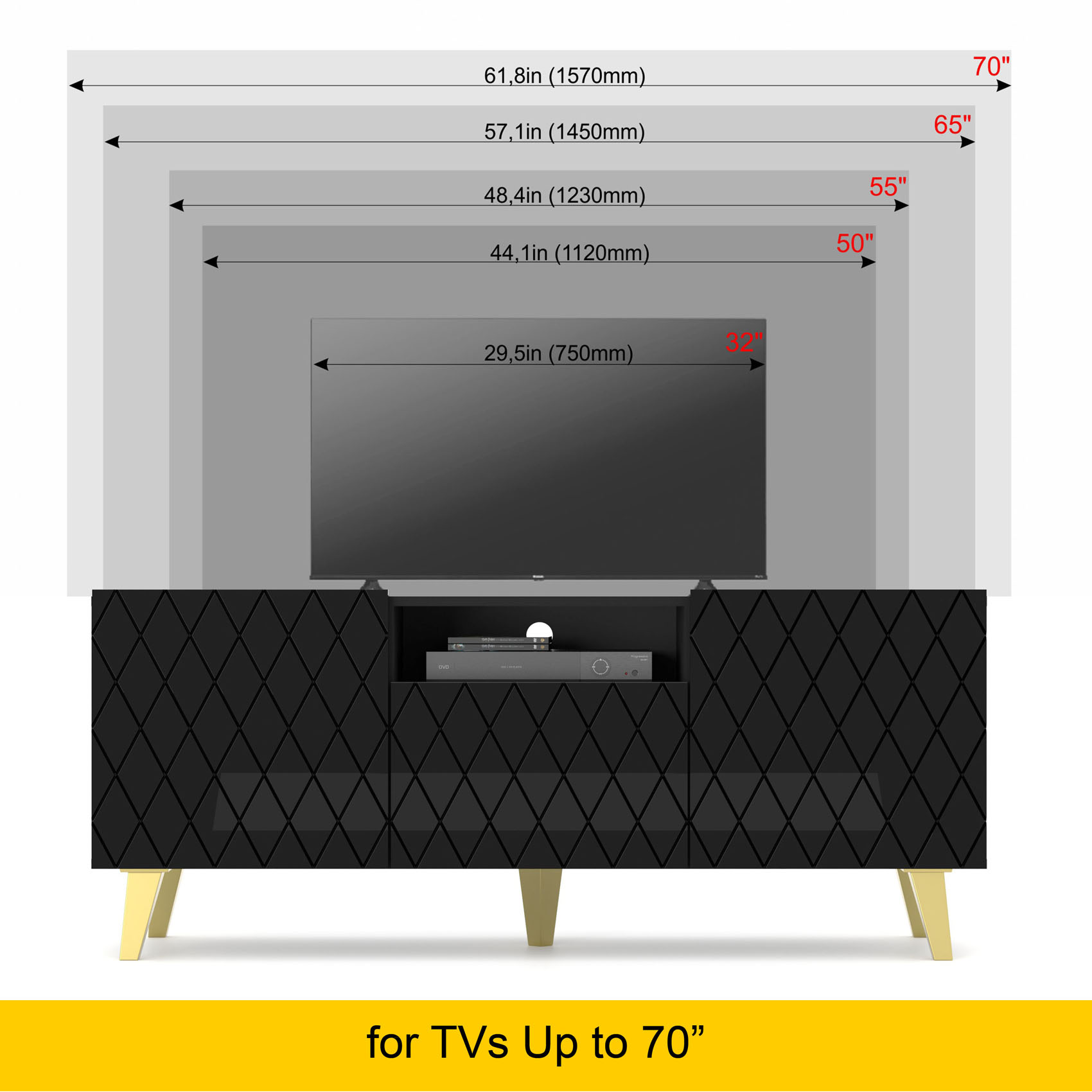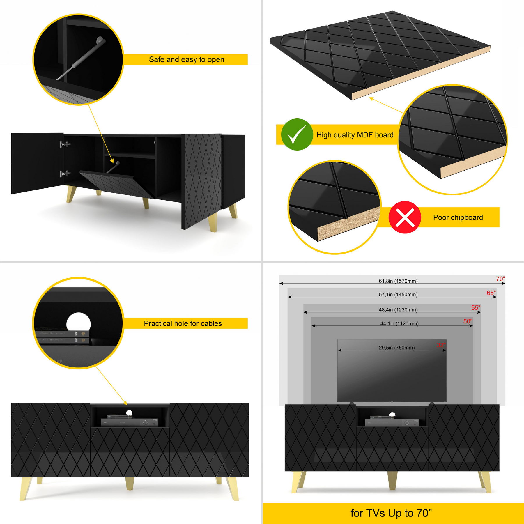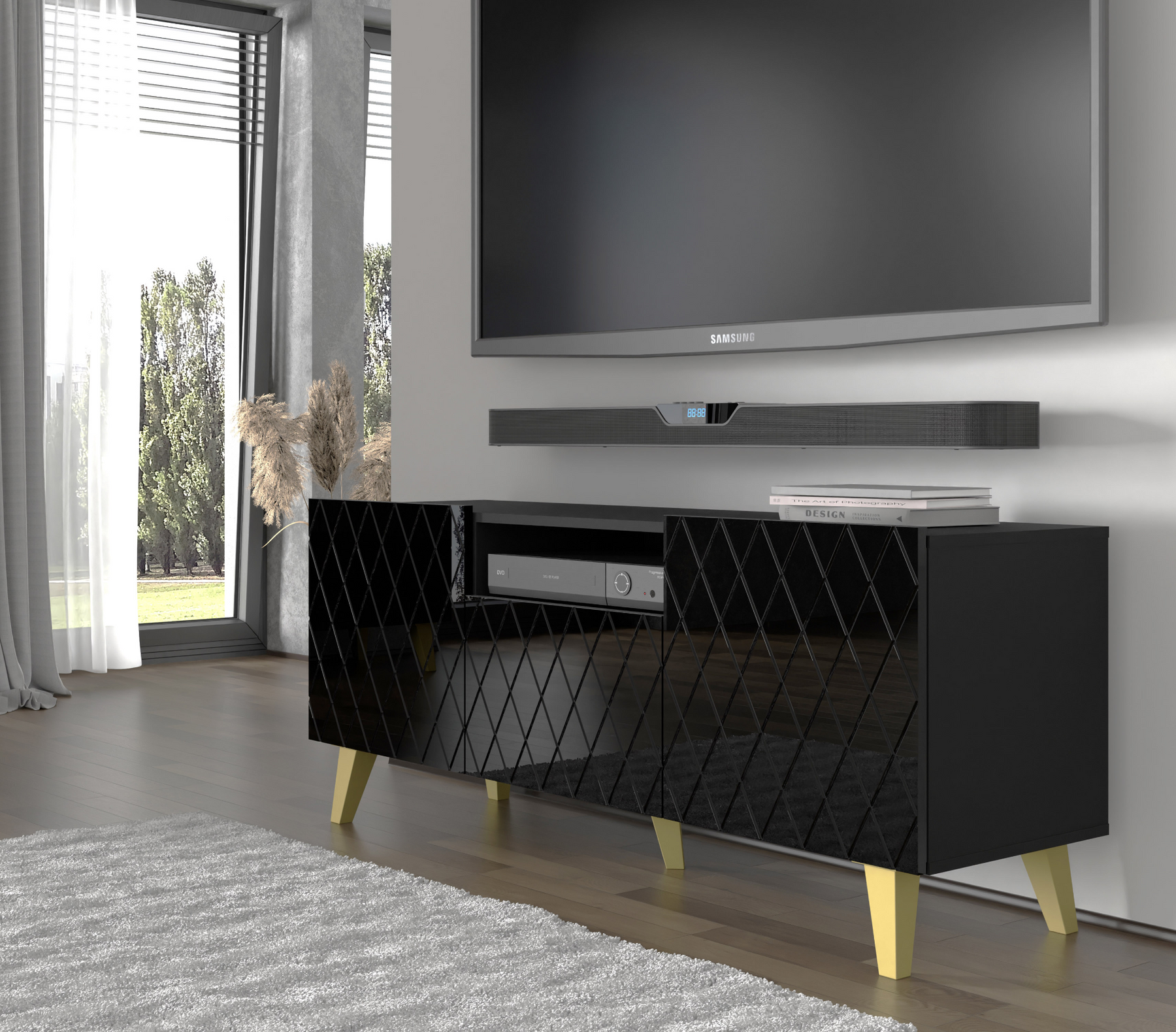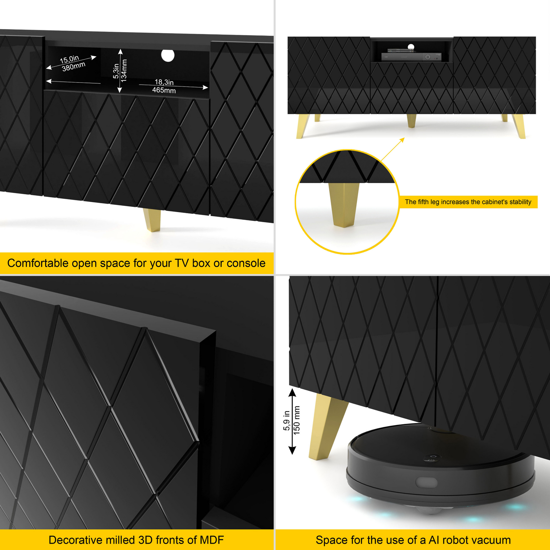 Classic Color Combination: With a black matt body, black gloss fronts, and gold legs, this TV stand adds a sophisticated touch to any living room.