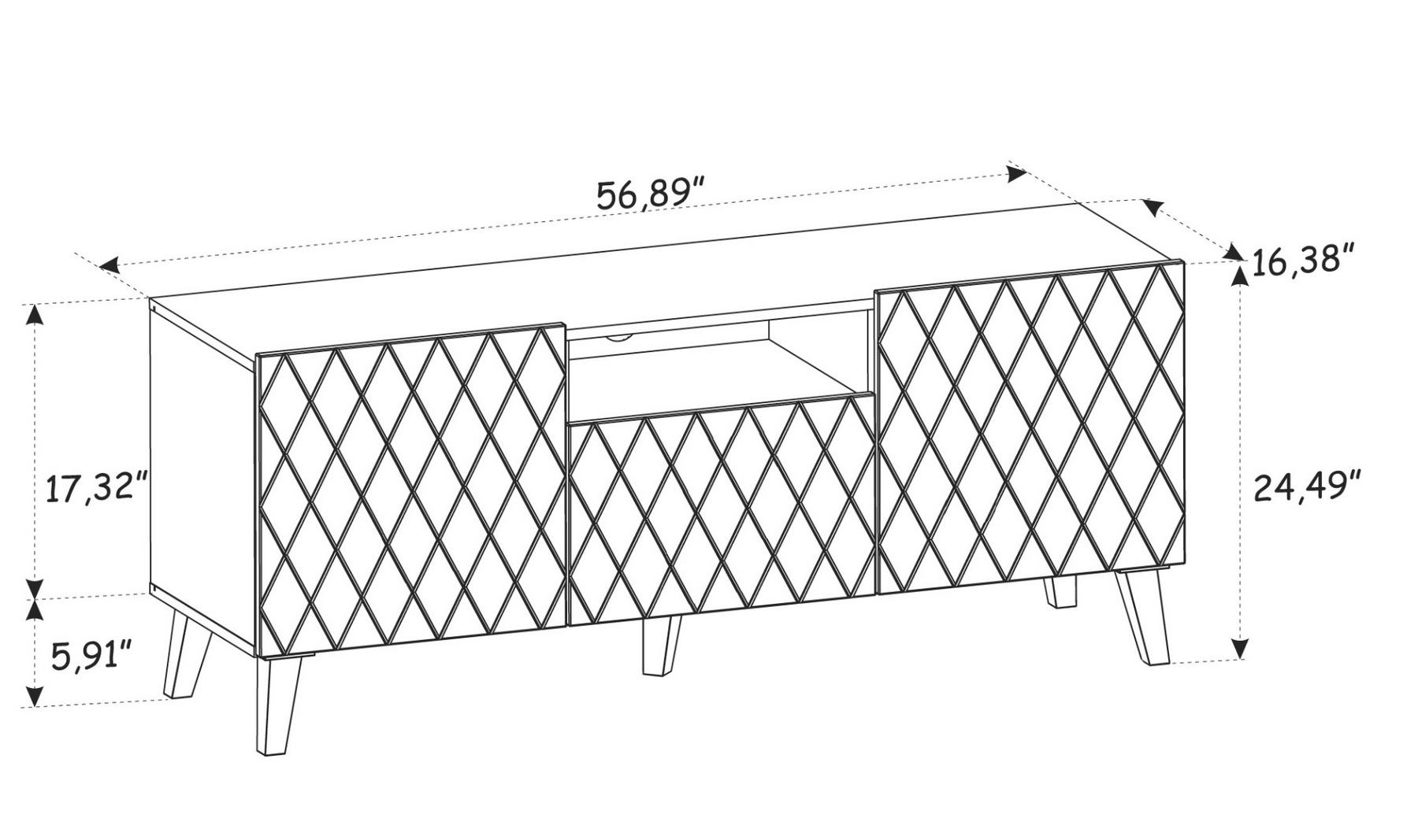 Dimensions: Width: 56.89 in, Depth: 16.38 in, Height: 24.49 in