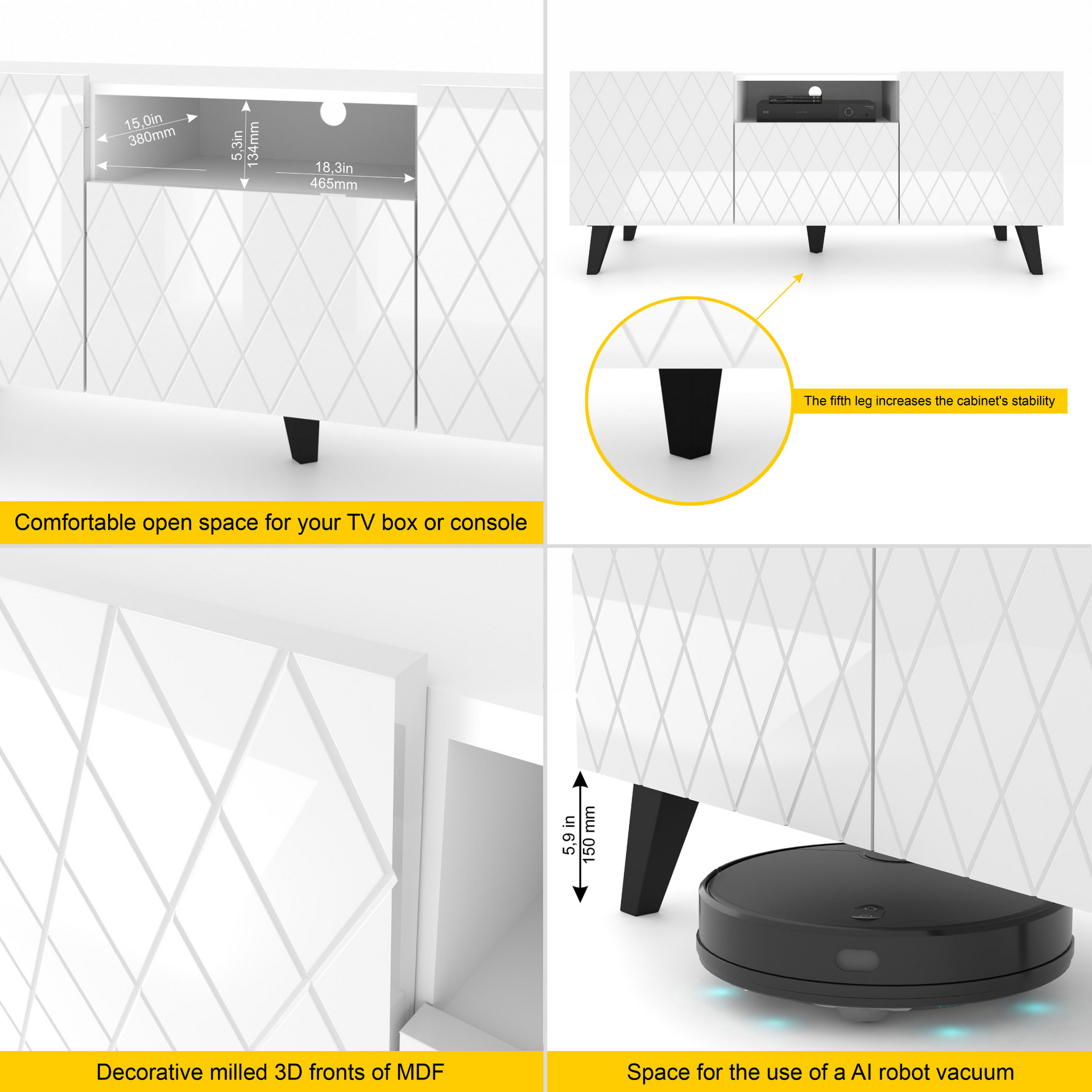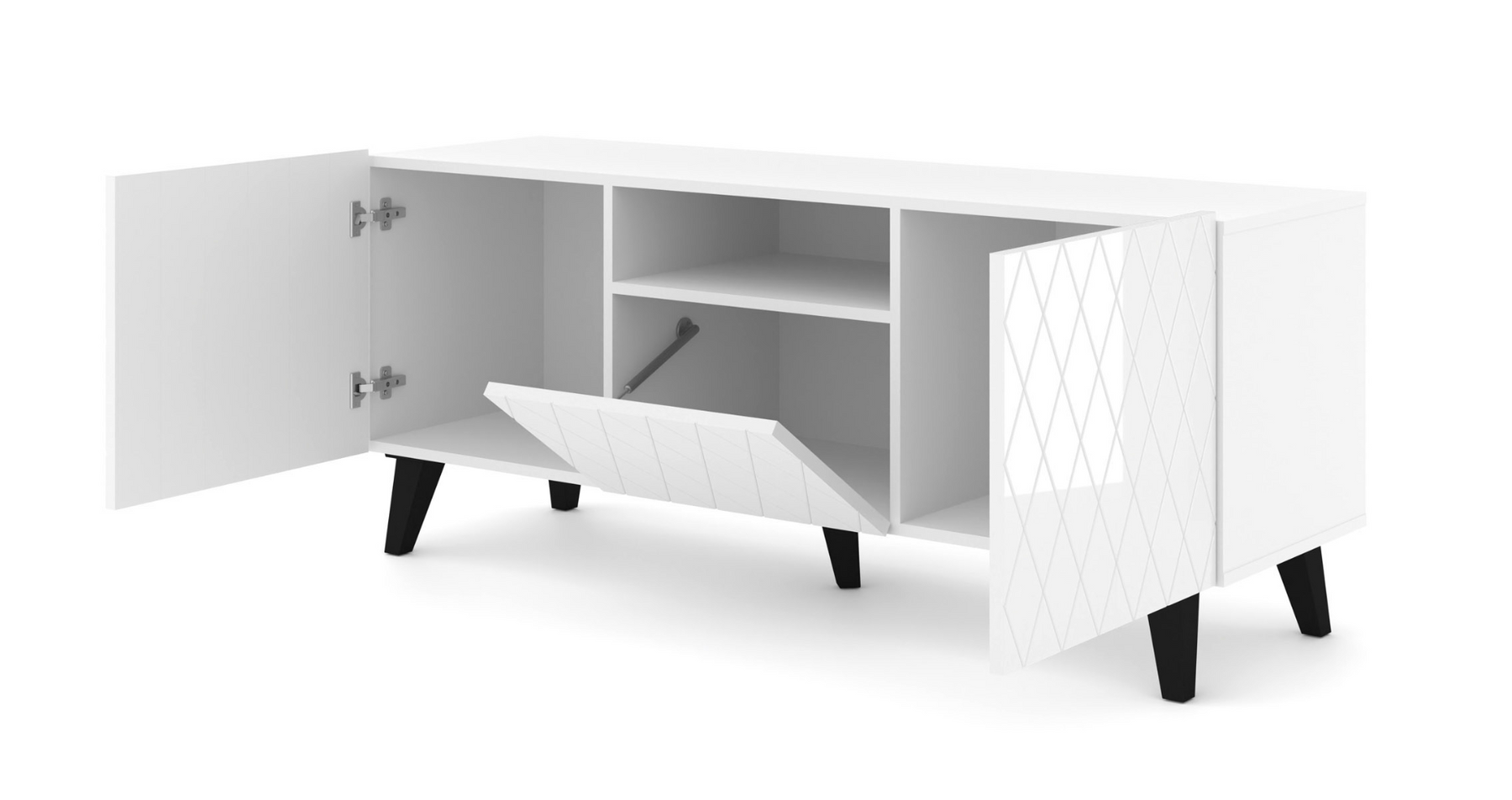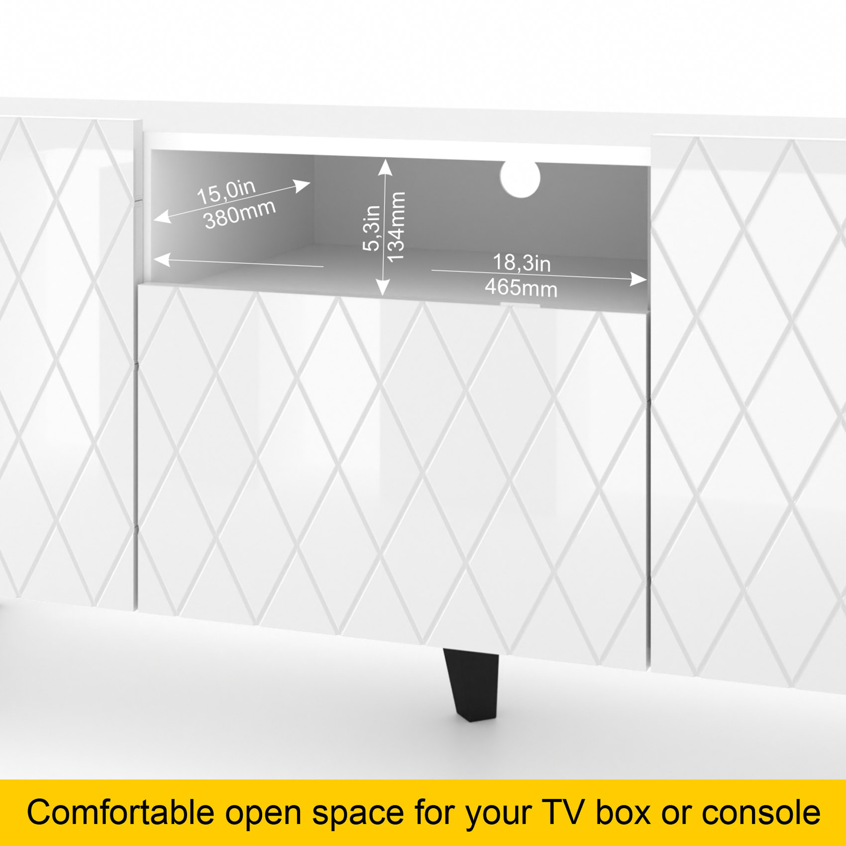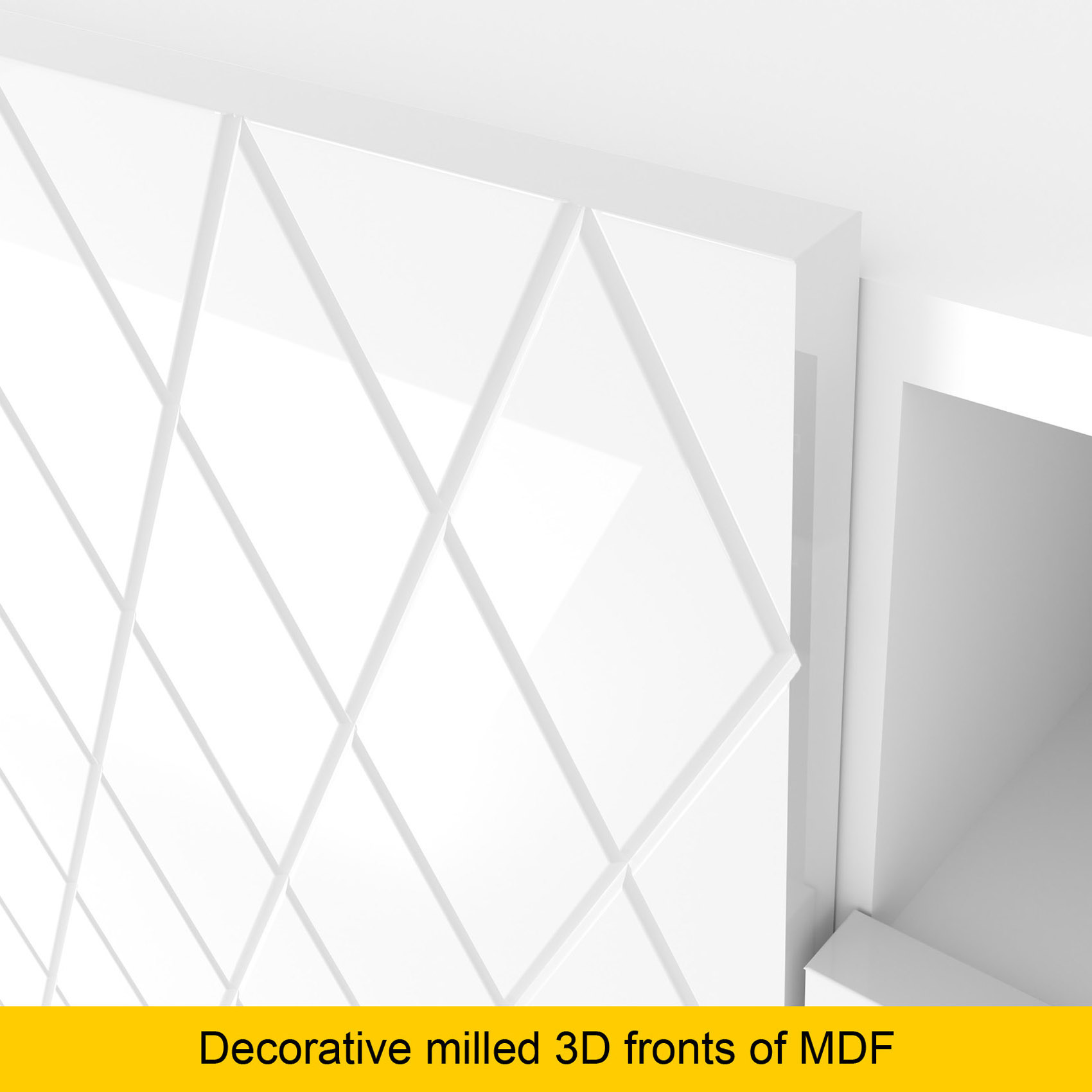 High-Gloss Finish: The stunning white gloss fronts are impressively decorated to enhance your living room's elegance.