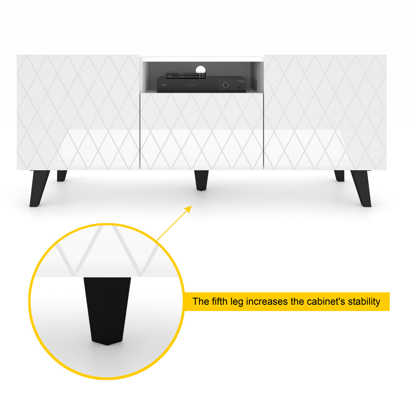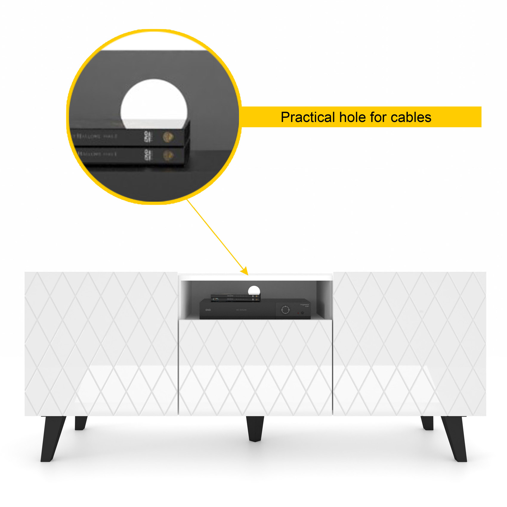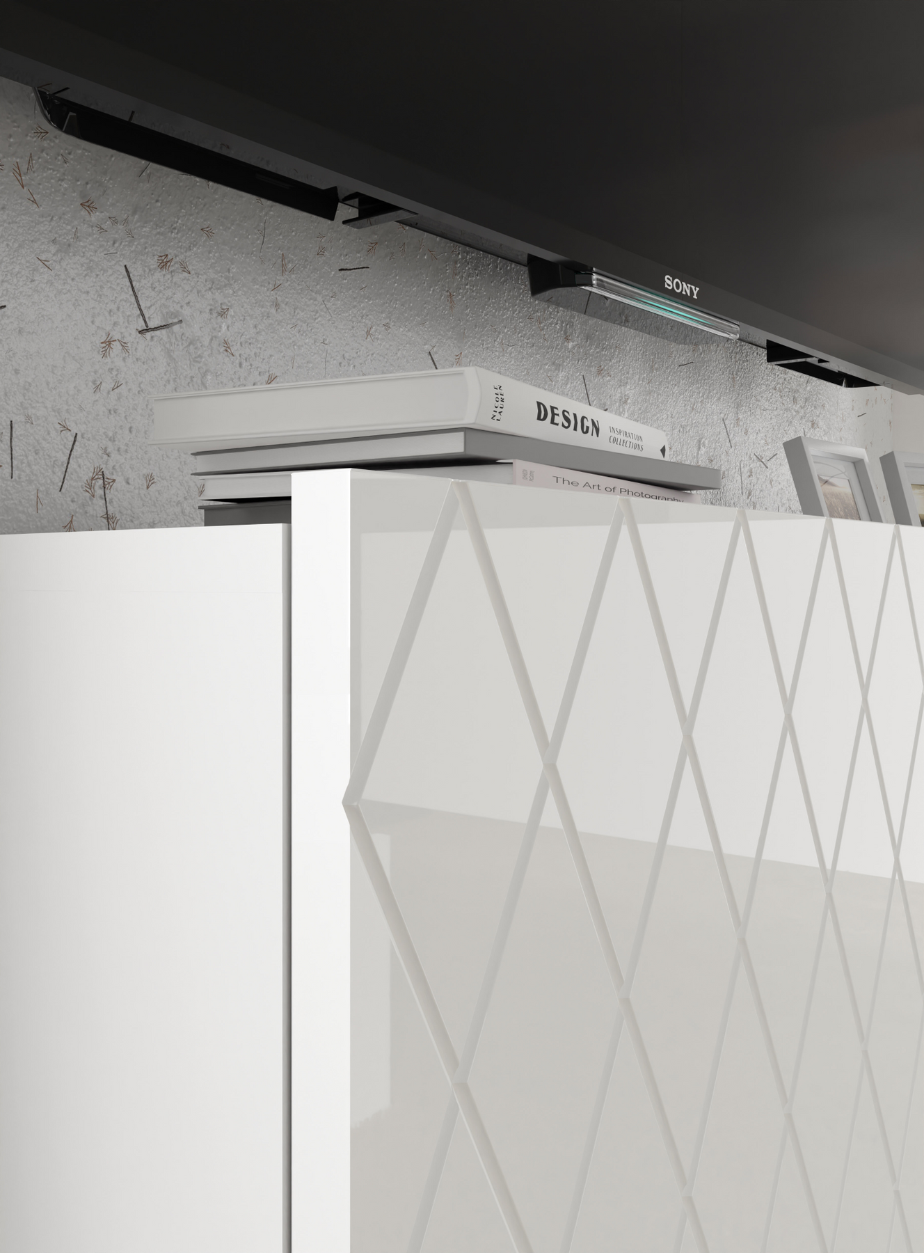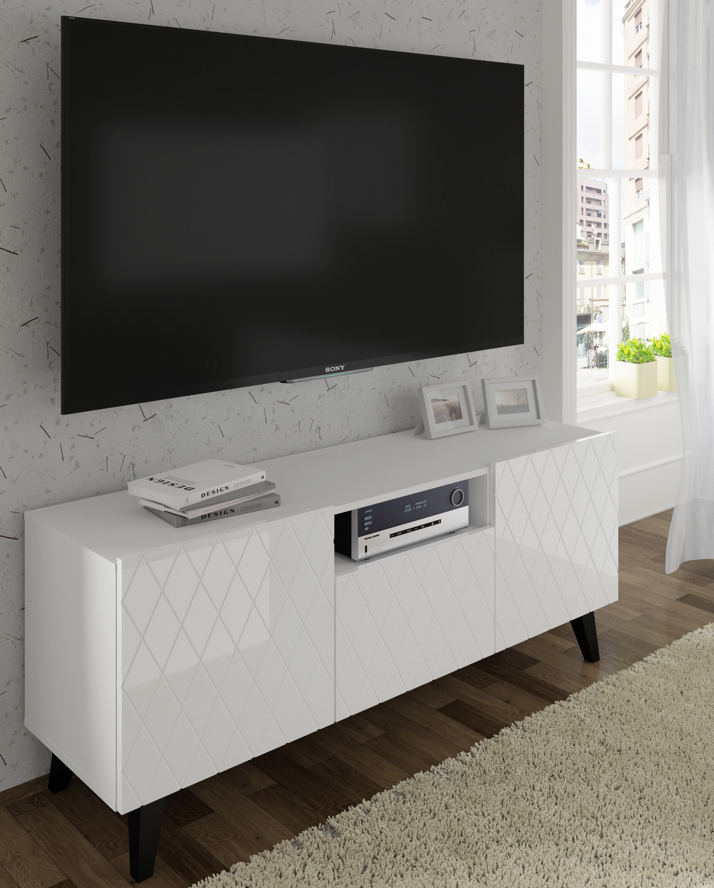 High-Gloss Finish: The stunning white gloss fronts are impressively decorated to enhance your living room's elegance.