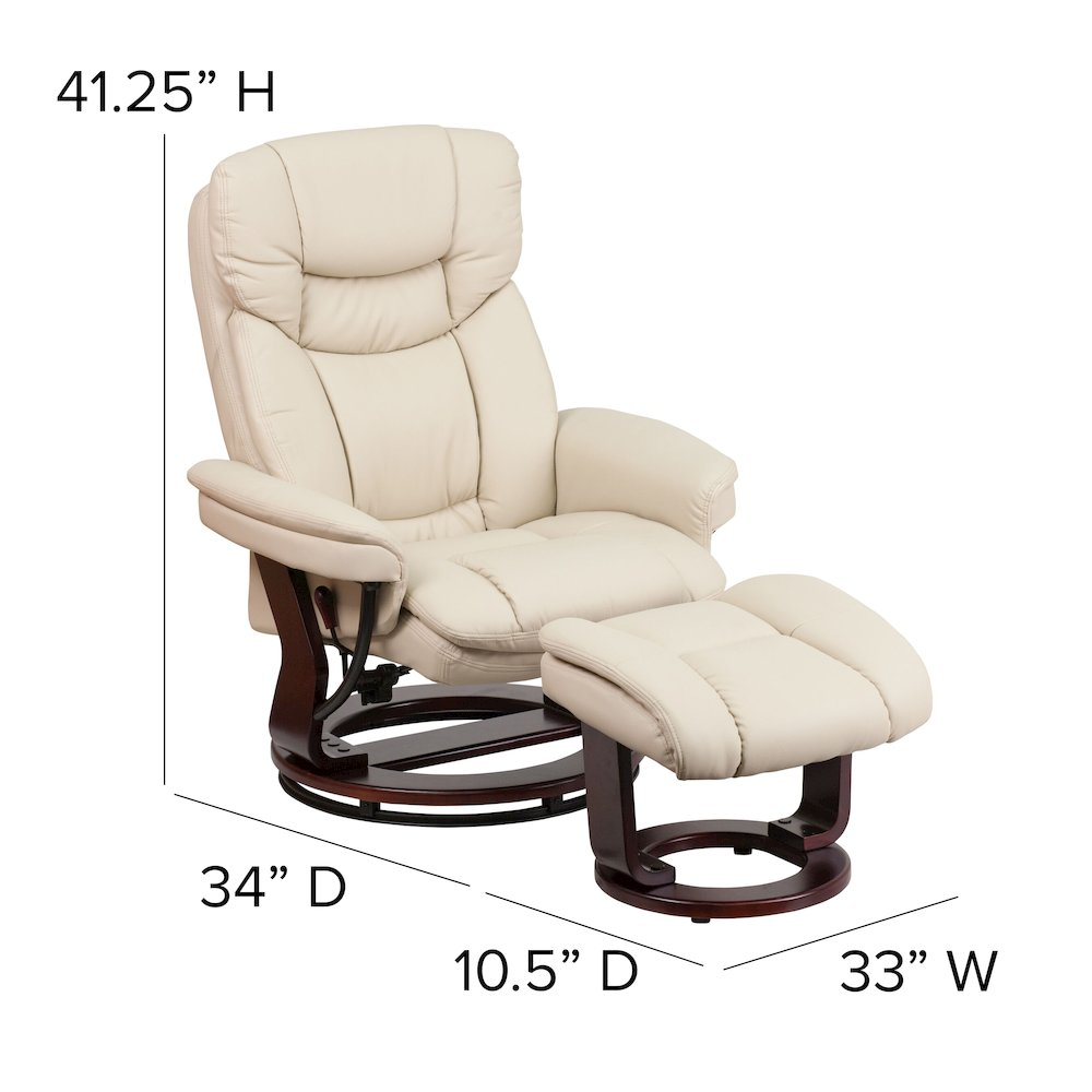 Recliner and Ottoman Set for home or office use Beige LeatherSoft Upholstery Plush Arms, Seat and Back padded with CAL 117 fire retardant foam Infinite Adjustments from upright to fully reclined with the lever under the right arm 7" Wall clearance to fit in small spaces Ottoman Size: 19.75"W x 18"D x 16.25"H Recliner Chair has Ball-Bearing Swiveling Mahogany Wood Base with Floor Protector Glides LeatherSoft is leather and polyurethane for added Softness and Durability This product cannot ship to Canada 0 Specifications: - Attribute Dimensions (in) : 41.25, 44.5 - Box 1 Height : 24.00 - UPC : 889142014775 - Box 1 Width : 26.00 - Brand : Flash Furniture - Box 1 Weight : 58.00 - Box 1 Depth : 32.00 - Attribute Depth (in) : 44.5 - Delivery Time (days) : 6 - Packing Time (days) : 2 - Length: 44.5 in, Width: 33.0 in, Height: 41.25 in
