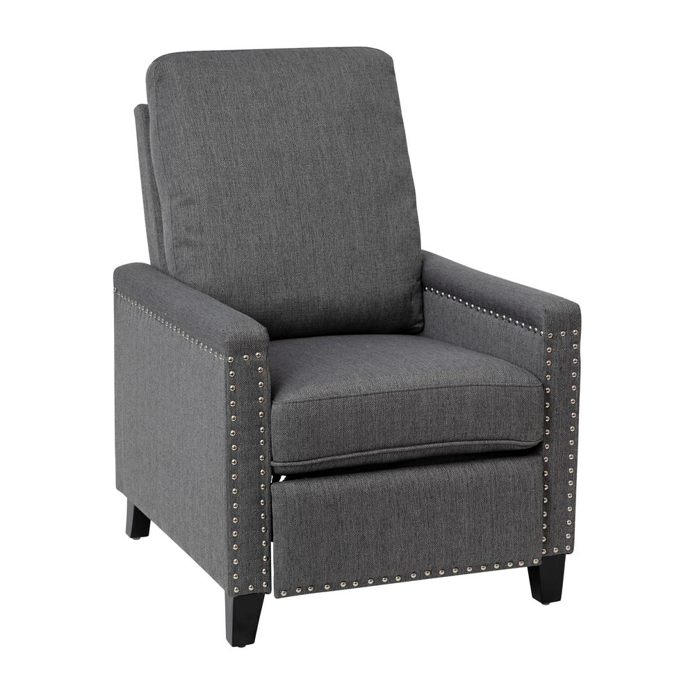Modern sensibilities abound in the fresh design of this push back reclining chair. Neutral light gray polyester fabric upholstery, pillow style back, straight arms, and accent nailhead trim give an updated look to a classic style. High flared legs in a wood grain finish complete the look of this recliner chair and make floor cleaning easier. Furnishing a new home or upgrading the look of your current space shouldn't be a stressor. A solid plywood core and steel frame with metal screw reinforcements hold up to 275 lbs. static weight to ensure a worry-free seating experience while the amply padded pocket spring seat provides comfort. Simply place your hands on the arms and push backwards allowing your weight to recline the back and raise the footrest. Assembly requires no tools and takes less than 10 minutes with the included illustrated assembly instructions. Spot clean with water and a neutral detergent to maintain the chairs appearance. Fixed plastic floor glides will prevent damage to your hard flooring surfaces when moving the chair.