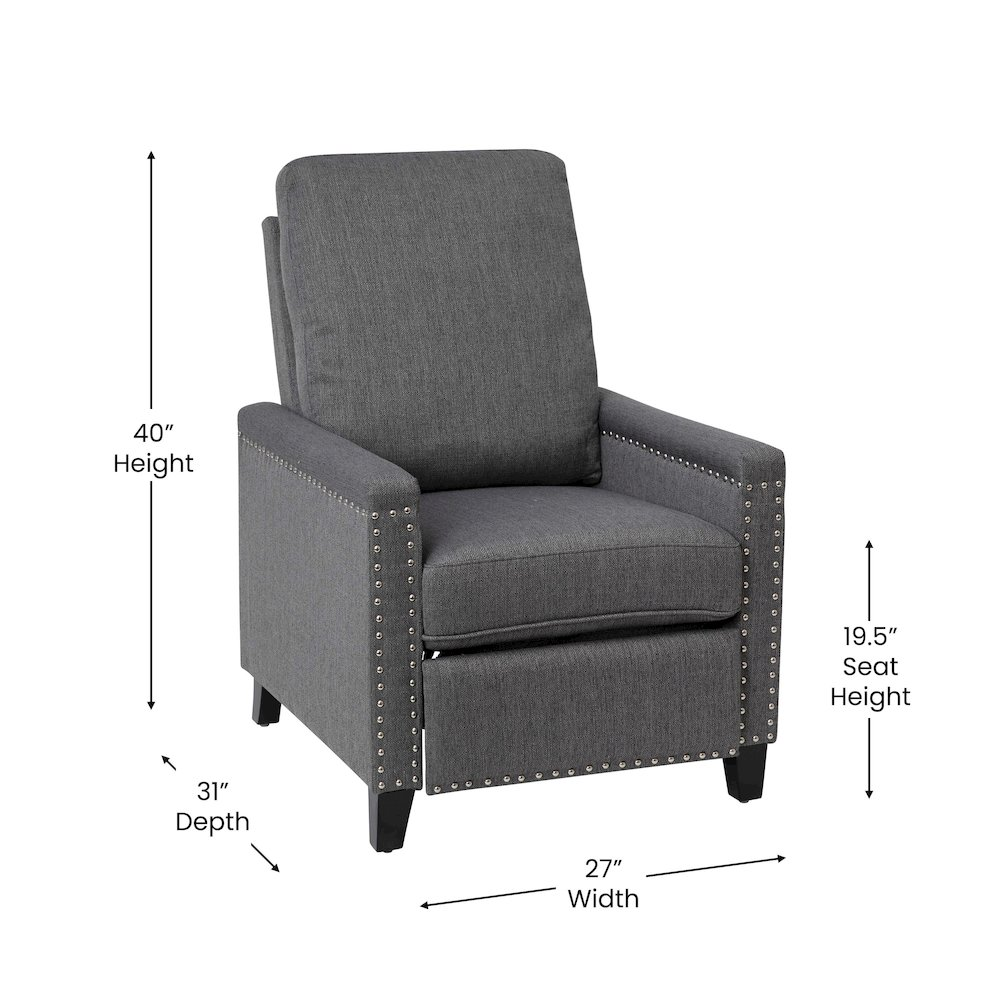 Push Back Transitional Style Reclining Chair with Nail Accent Trim Gray Polyester Fabric Upholstery blends in any space Straight Arms alleviate tension from the neck and shoulders Foam Padded Pocket Spring Seat for a comfortable seating experience High Wood Grain Finish Legs add style and make flooring maintenance easier Plywood Core, Steel Frame and Metal Screw Reinforcements holds up to 275 LBS. static weight Wall Clearance: 19" Assembles In 10 Minutes or Less with no tools required Spot Clean with Water and a Neutral Detergent Push Back Style Recline uses your body weight to control the angle of recline Specifications: - Box 1 Height : 21.00 - UPC : 840196327792 - Box 1 Depth : 27.50 - Box 1 Width : 30.00 - Brand : Flash Furniture - Box 1 Weight : 65.00 - Attribute Depth (in) : 57.5 - Attribute Dimensions (in) : 40, 57.5 - Packing Time (days) : 2 - Delivery Time (days) : 6 - Length: 57.5 in, Width: 27.0 in, Height: 40.0 in
