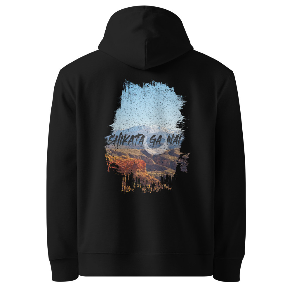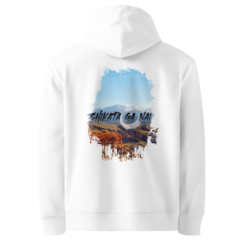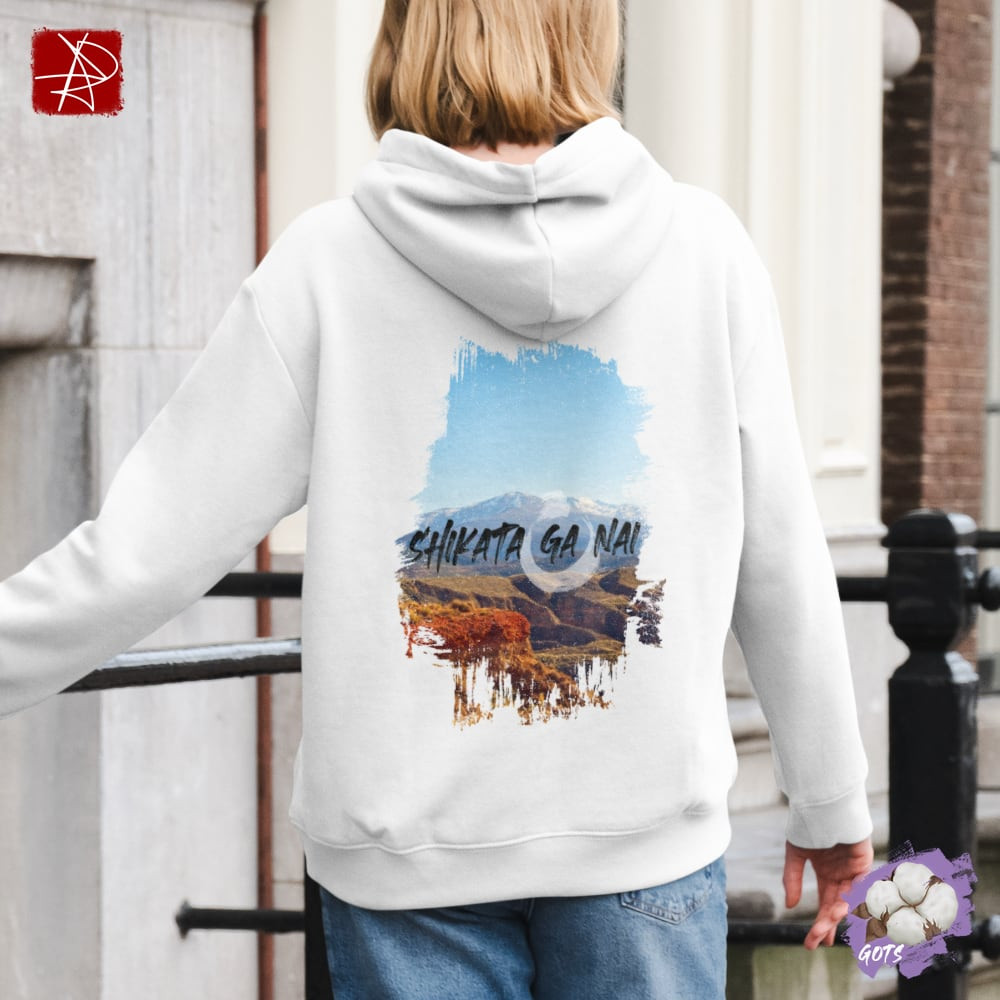The 'Shikata Ga Nai' hoodie embodies the Japanese philosophy of acceptance and resilience. The phrase 'Shikata Ga Nai' (仕方がない), meaning 'It cannot be helped,' is displayed in bold black brushstroke typography over a stunning mountain landscape. The vibrant blue sky and rugged terrain symbolize strength, serenity, and the beauty of embracing life's challenges with grace.