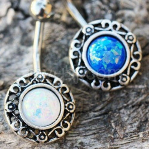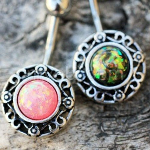 Antique-style belly button ring with adorned synthetic opal stone