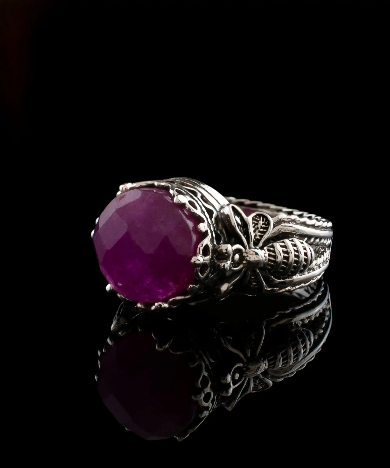 Enhance Your Style with the Bee Detailed Ruby Corundum Gemstone Filigree Art Women Silver Cocktail Ring