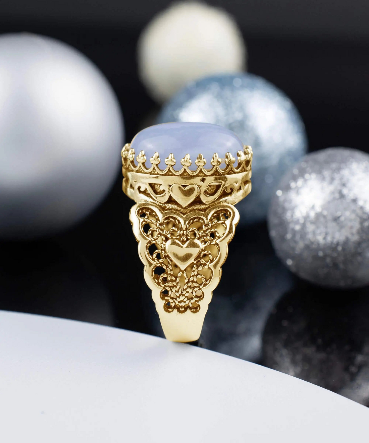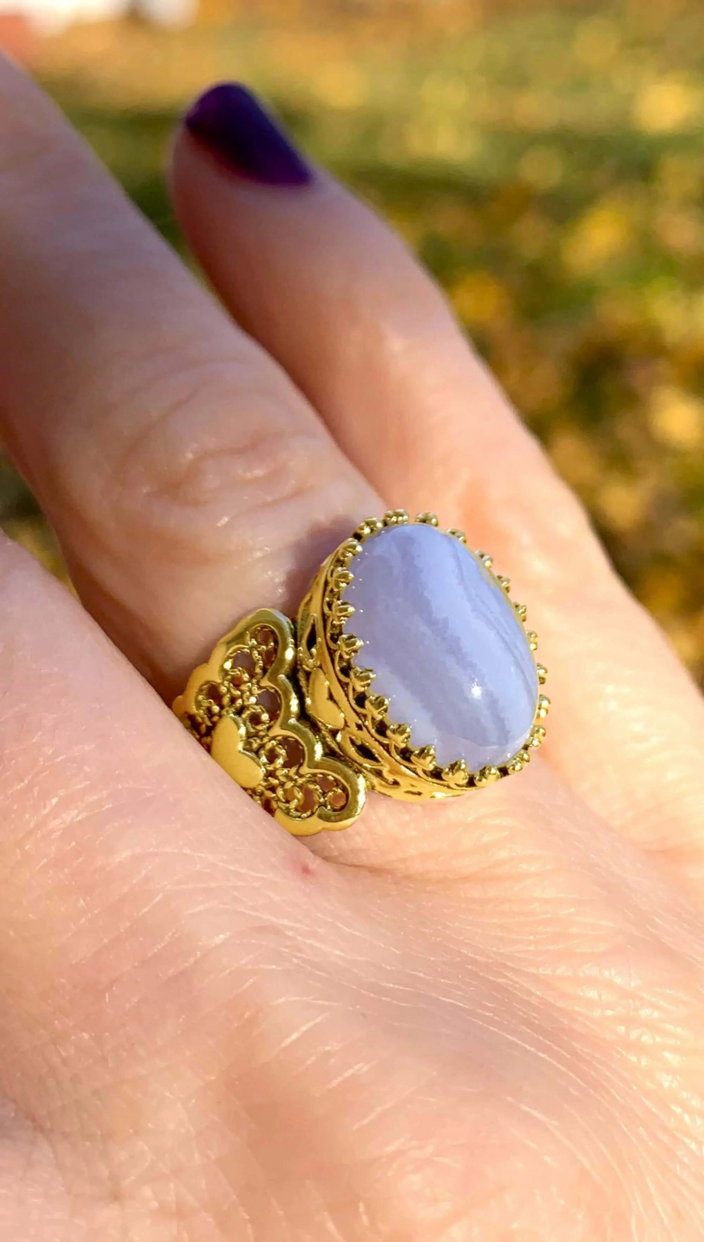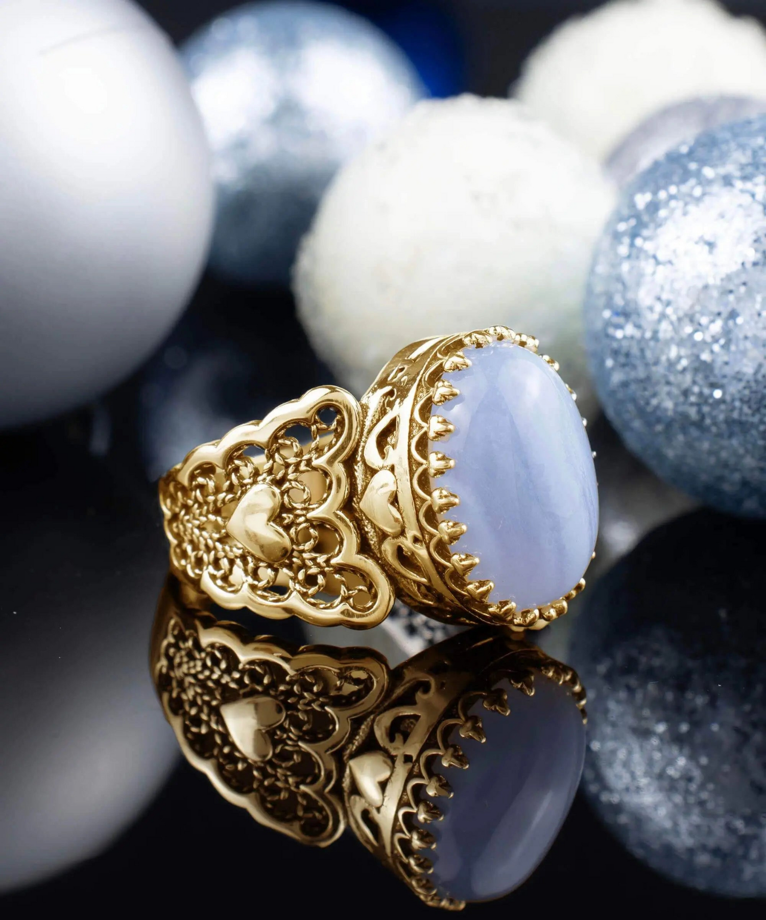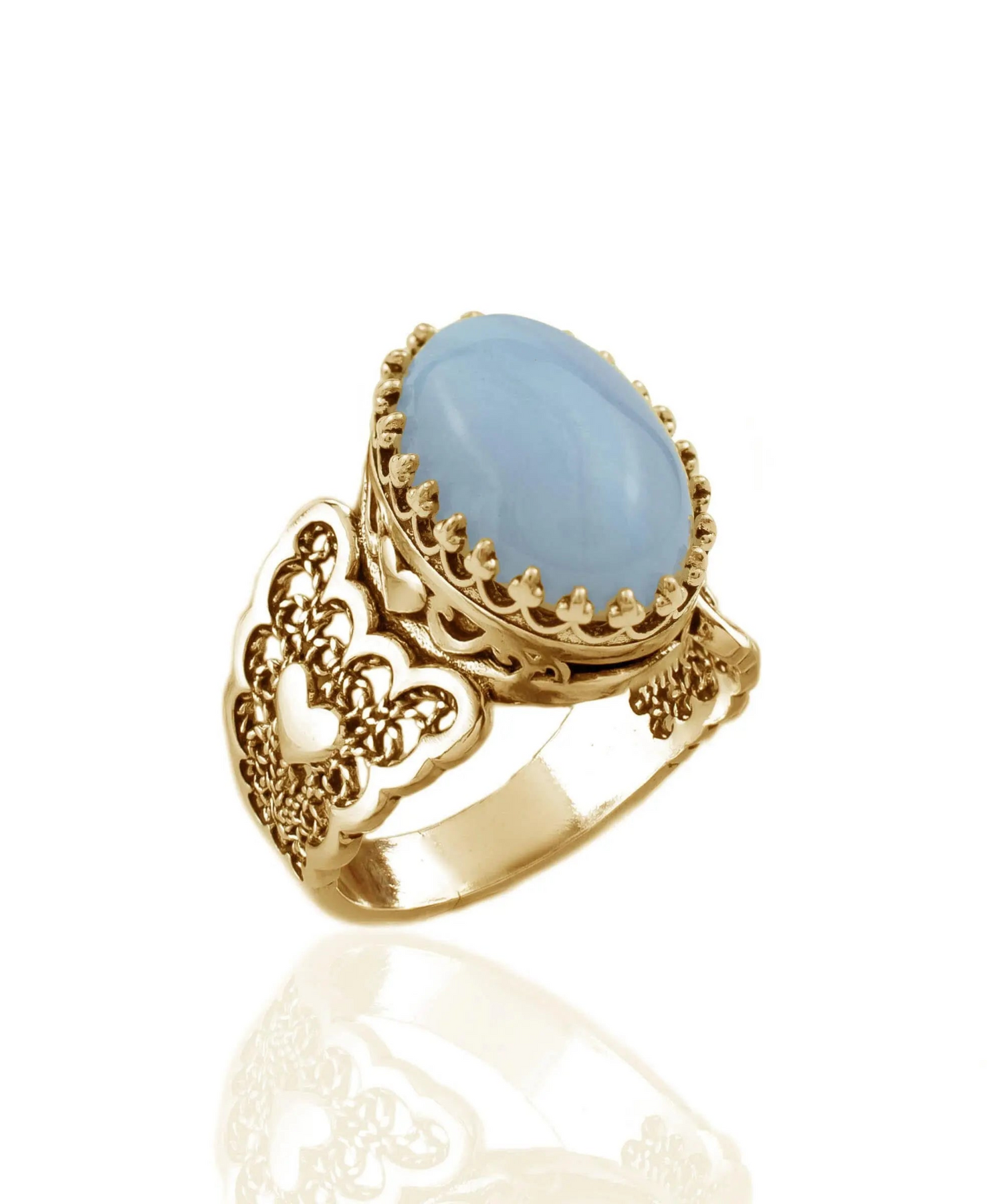 Elevate your style and make a statement with this stunning filigree cocktail ring from Filigranist. With its double heart design and blue lace agate gemstones, it's a true work of art that will capture attention wherever you go.