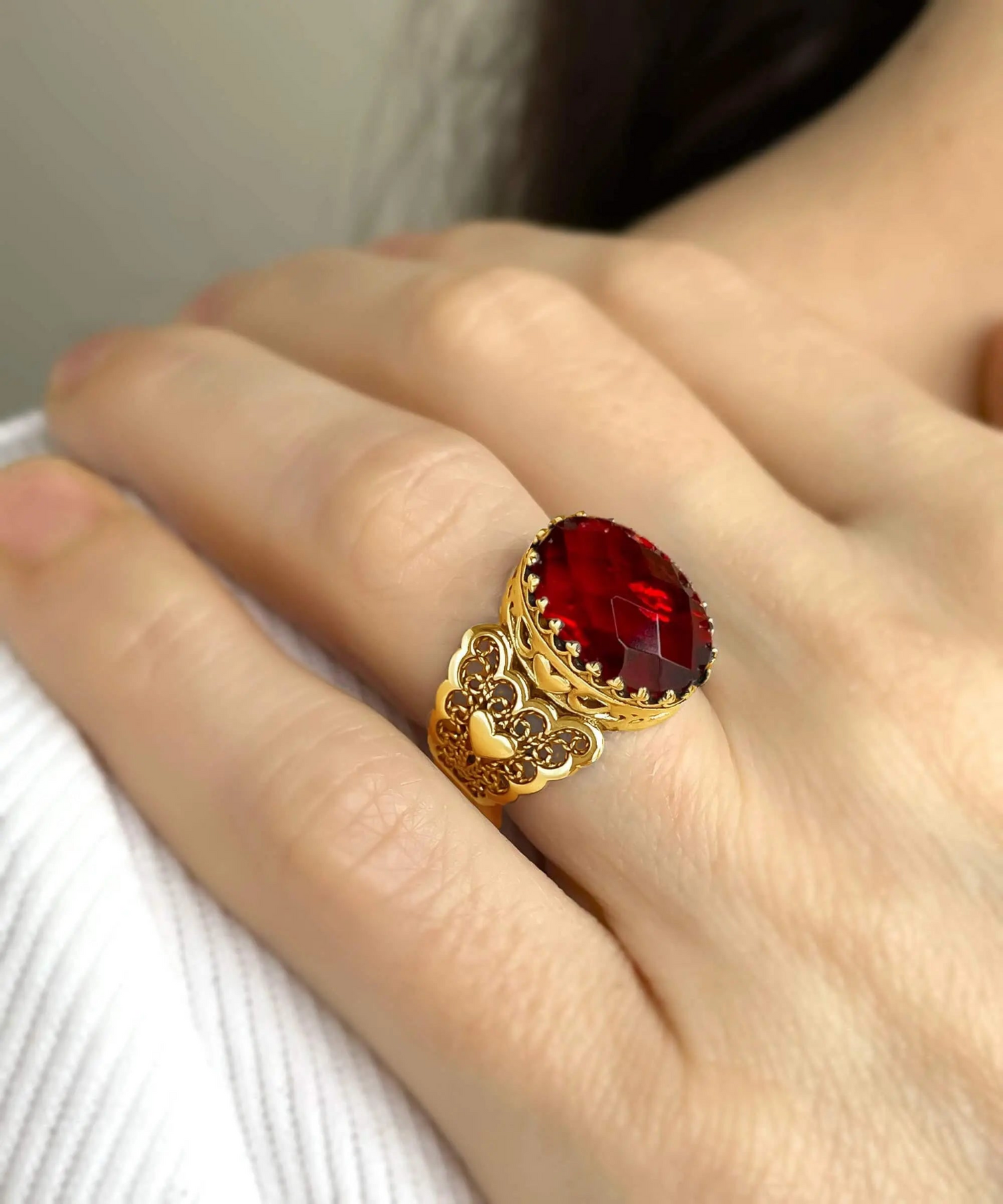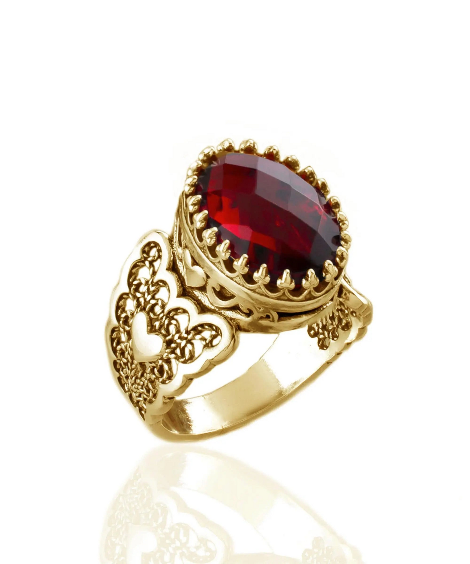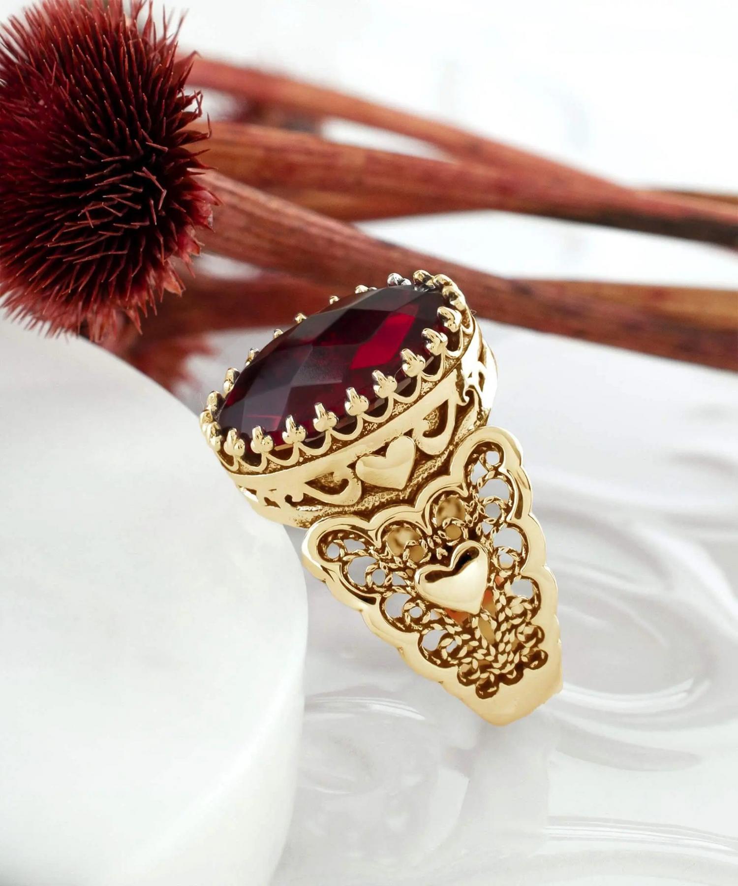 Enhance Your Style with the Double Heart Detailed Ruby Gemstone Filigree Art Gold Plated Sterling Silver Women Statement Ring