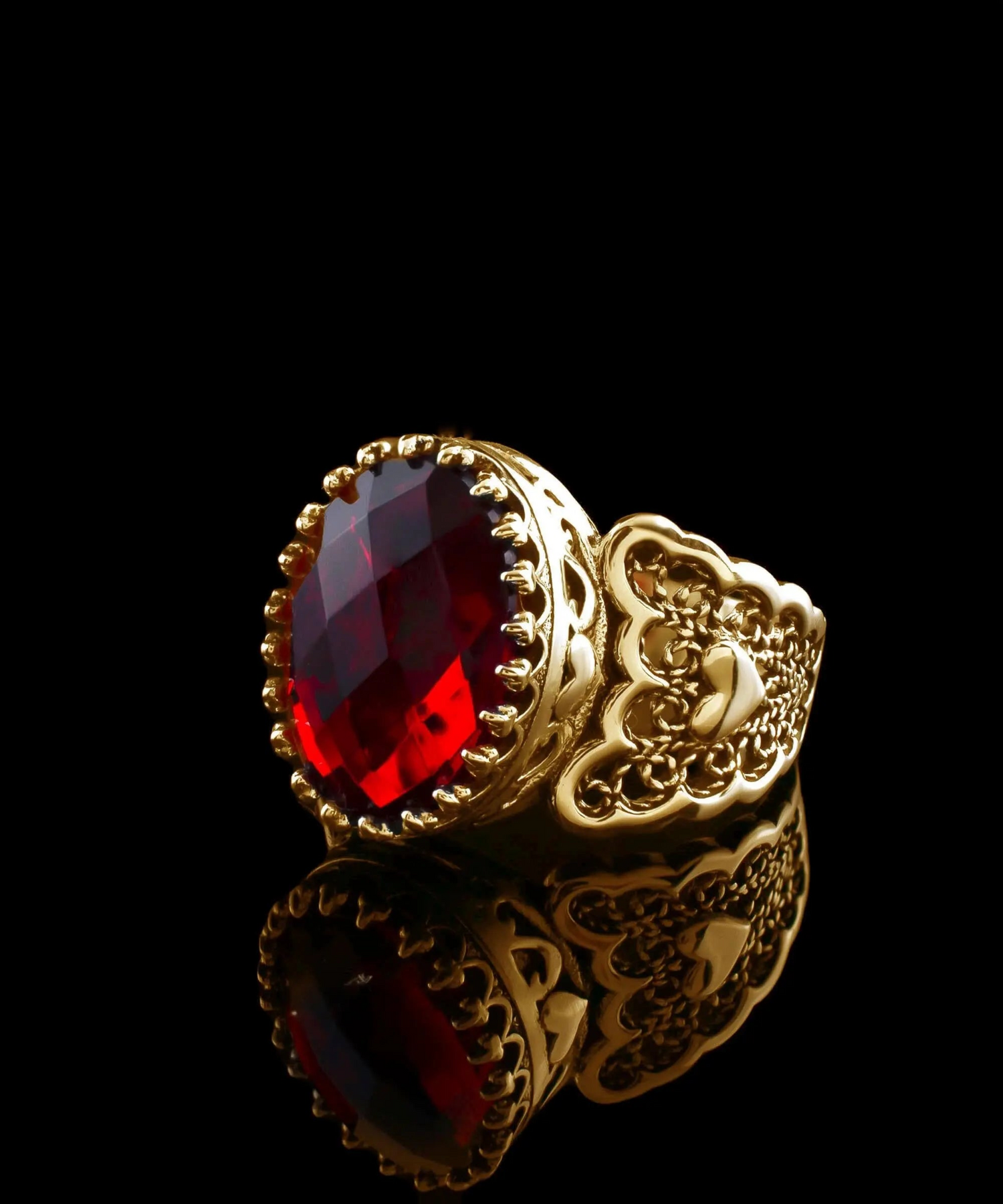 Elevate your style with Filigranist's Gold Plated 925 sterling silver filigree art double heart detailed statement ring featuring a stunning ruby quartz gemstone. This unique accessory is more than just a ring; it's a bold expression of your individuality and impeccable sense of style.