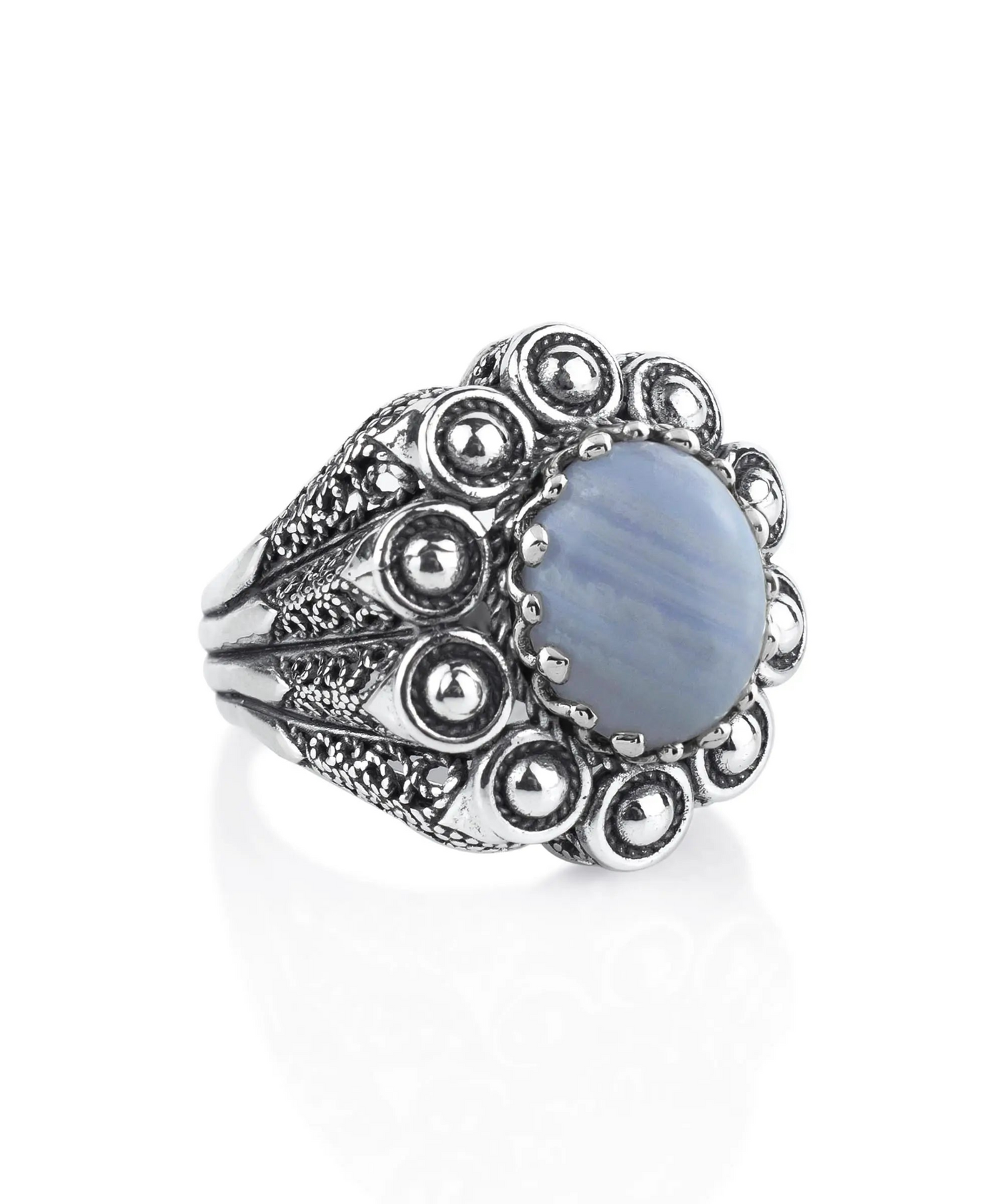 Shop now and own a piece of art with roots in Mesopotamia and Anatolia. This Filigree Art Blue Lace Agate Gemstone Women Statement Dome Ring is the perfect accessory to elevate your style and make a statement!