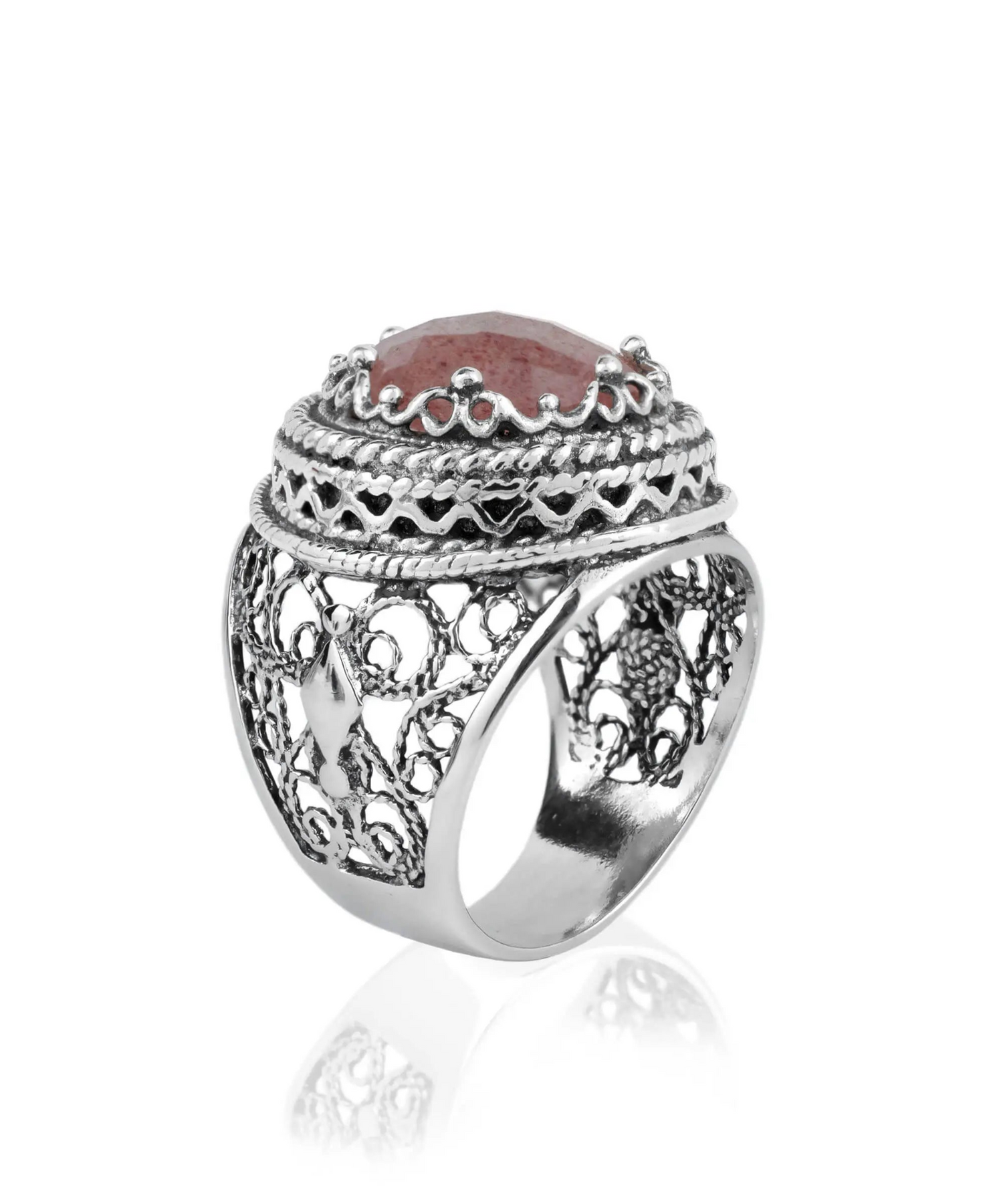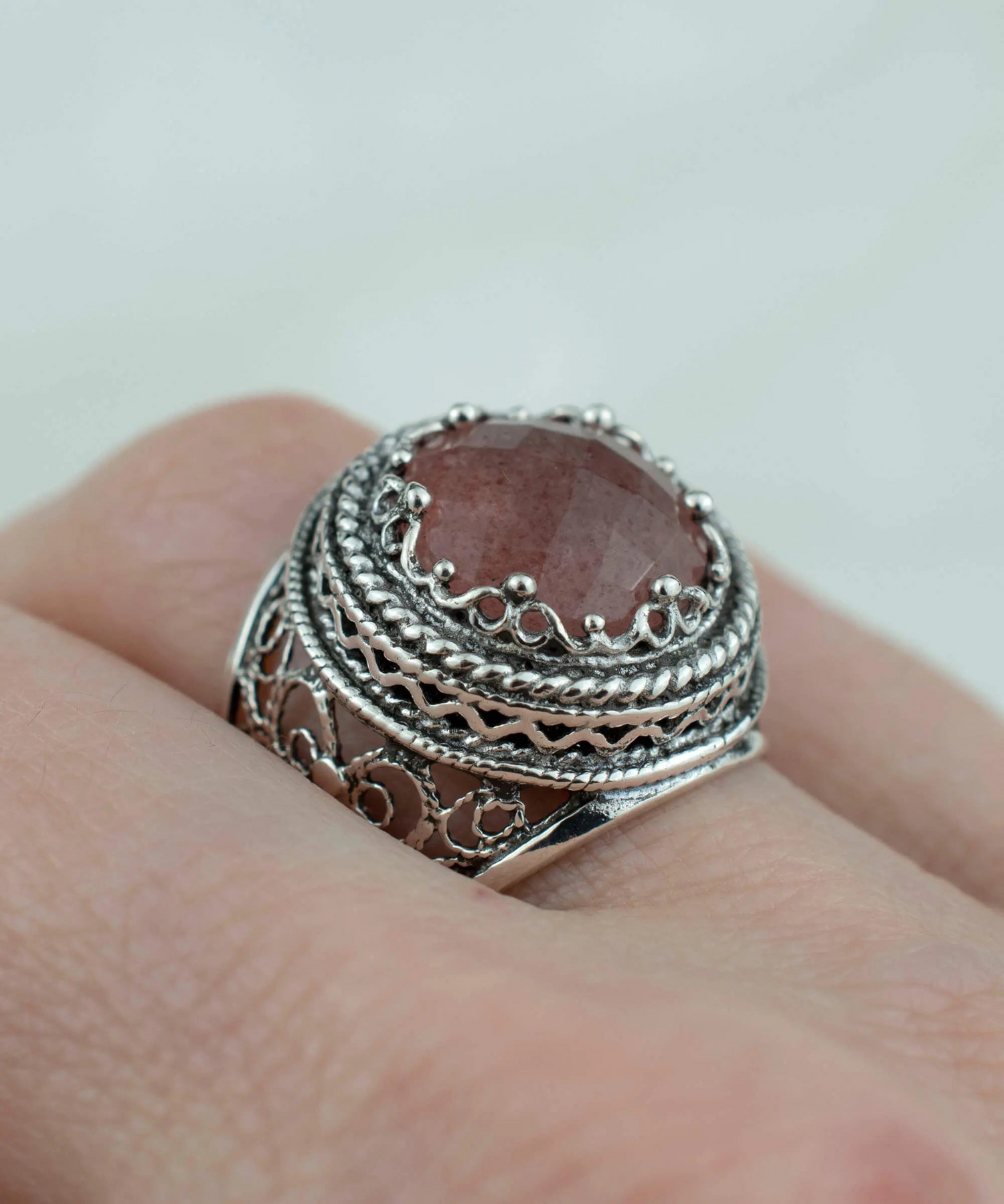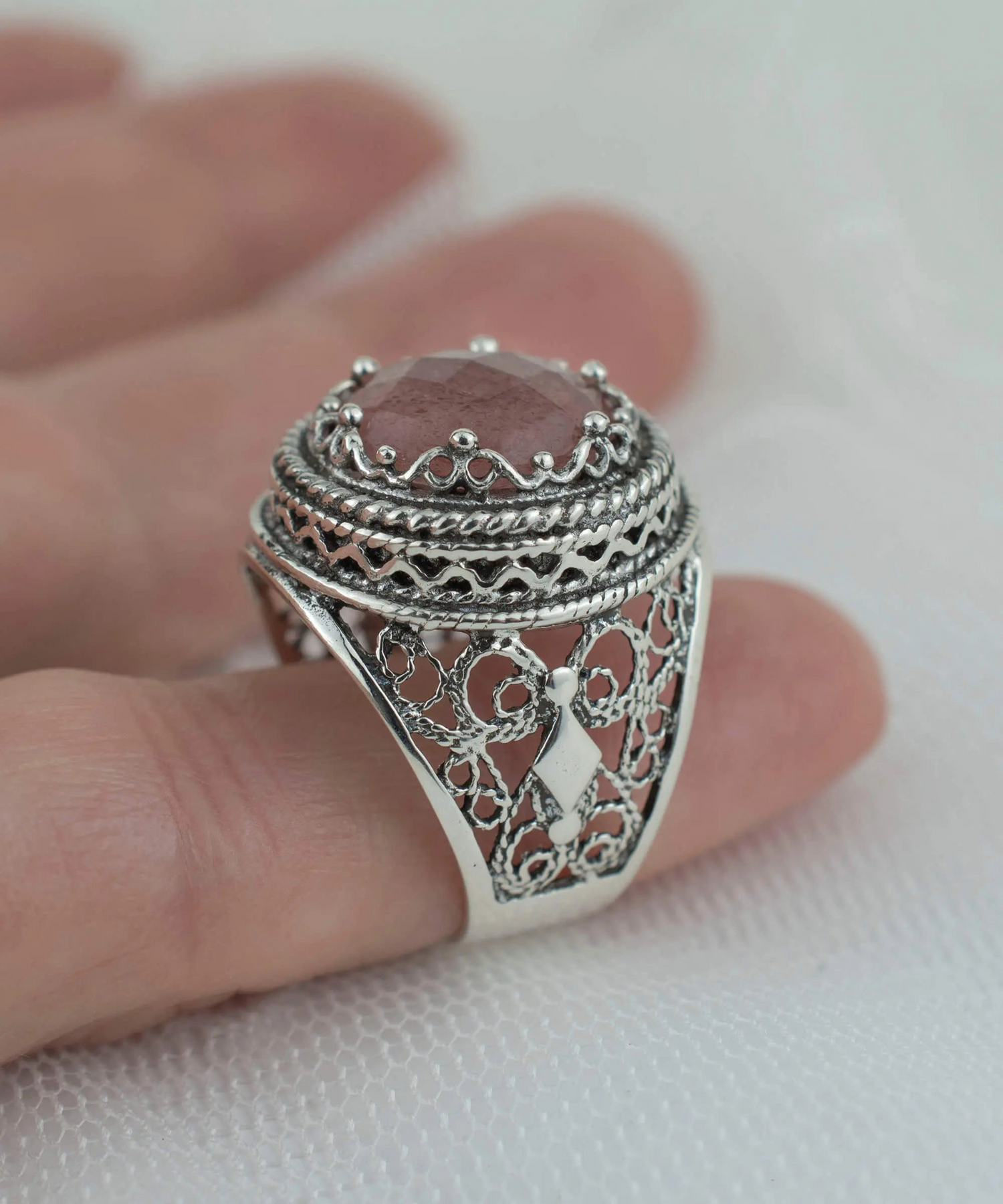 Introducing our Filigree Art Cherry Quartz Gemstone Women Silver Bold Ring, a handmade piece of jewelry that exudes elegance and sophistication. Crafted with precision and care, this stunning ring features a 12 mm double-sided faceted checkerboard round-cut Cherry Quartz gemstone set within an intricate filigree design.