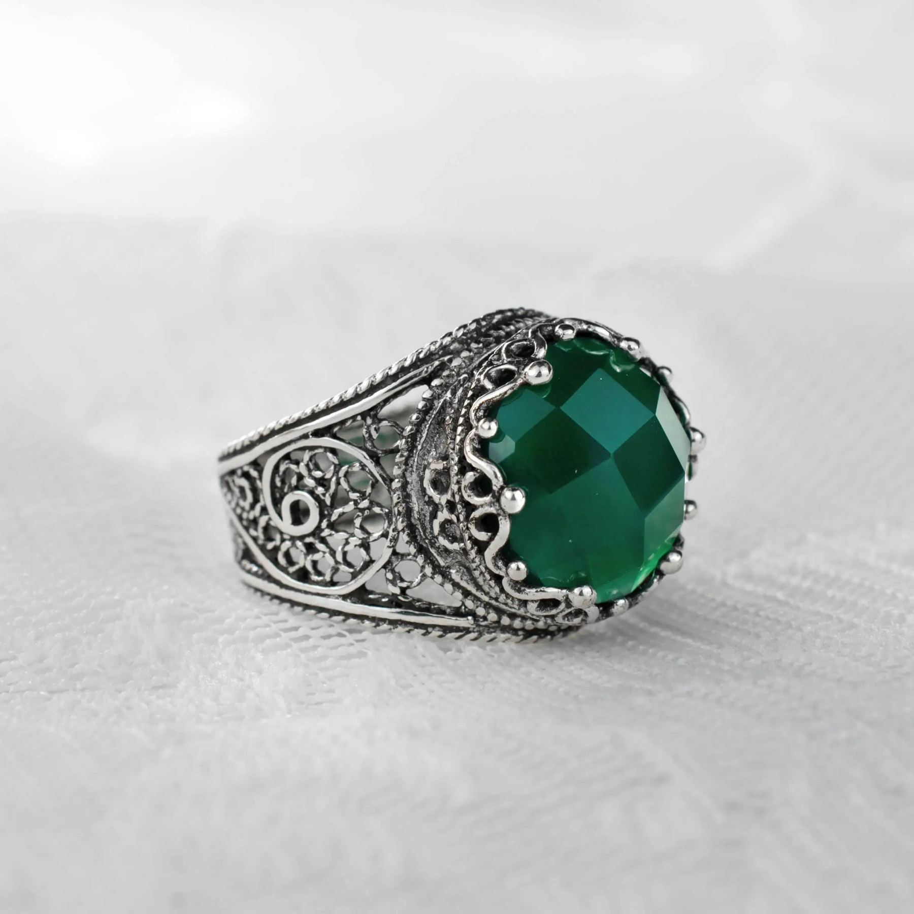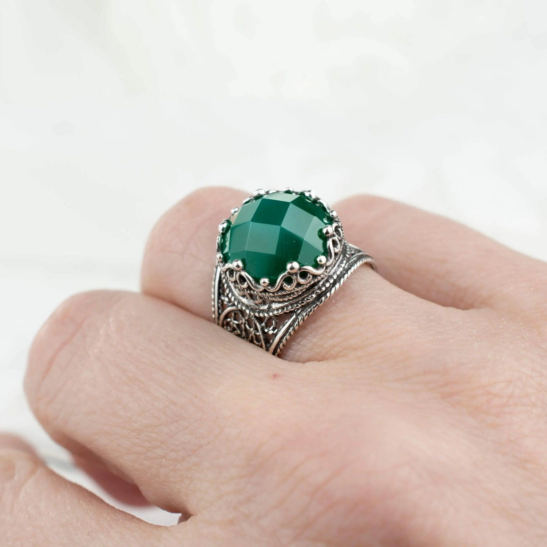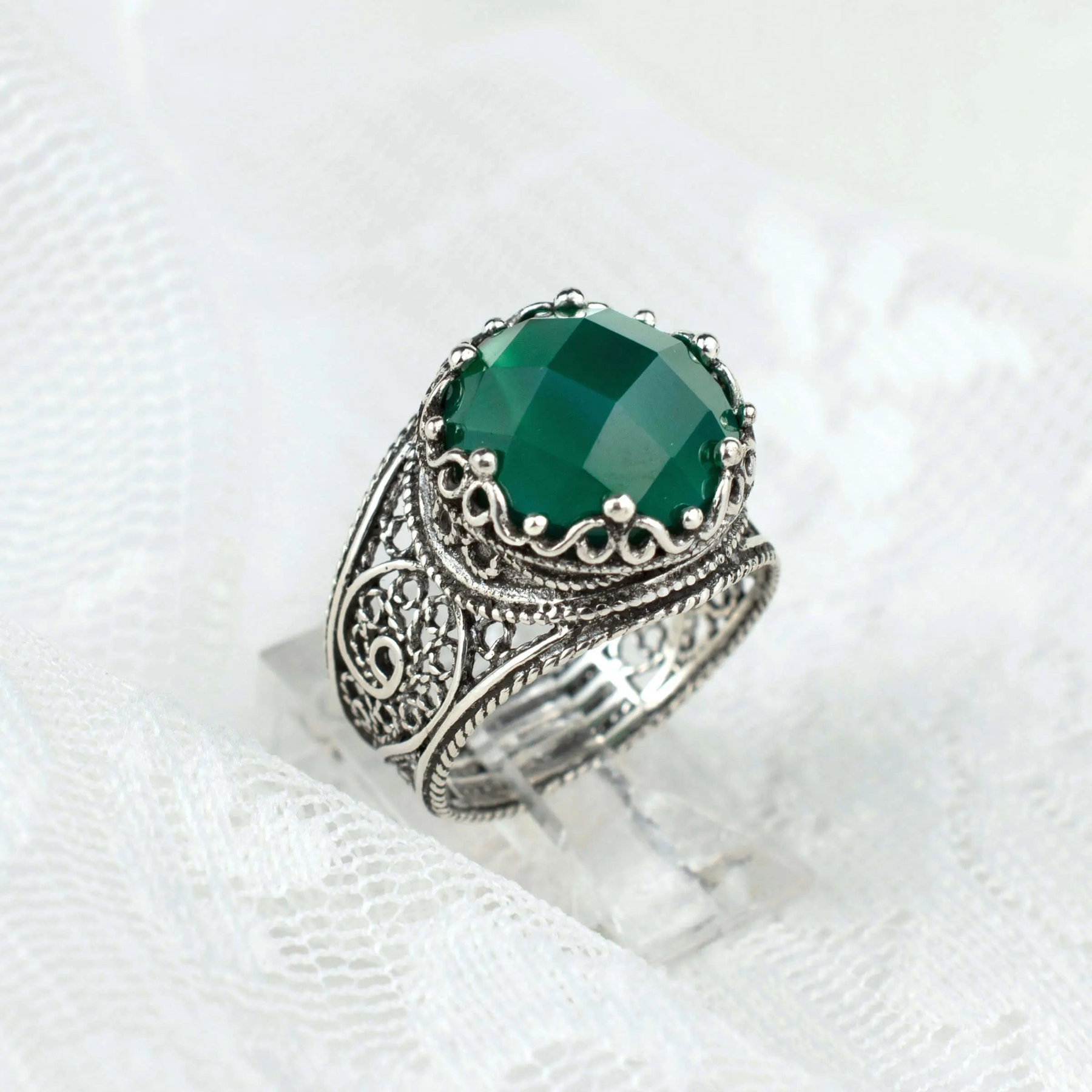 Elevate Your Style with the Handmade Filigree Art Green Agate Gemstone Crown Design Women Sterling Silver Cocktail Ring
