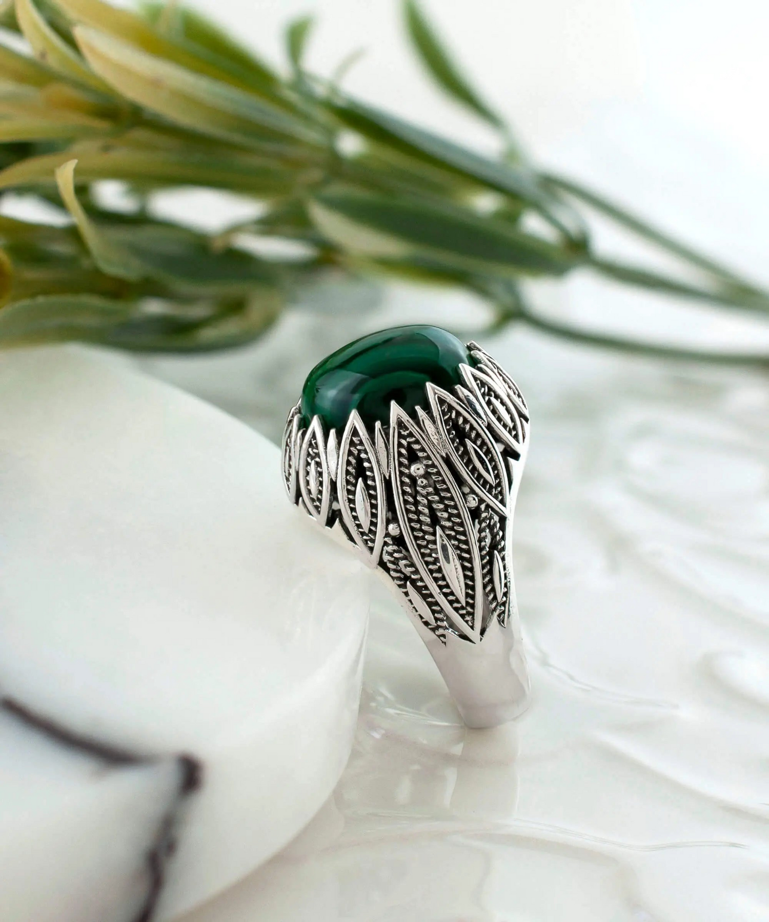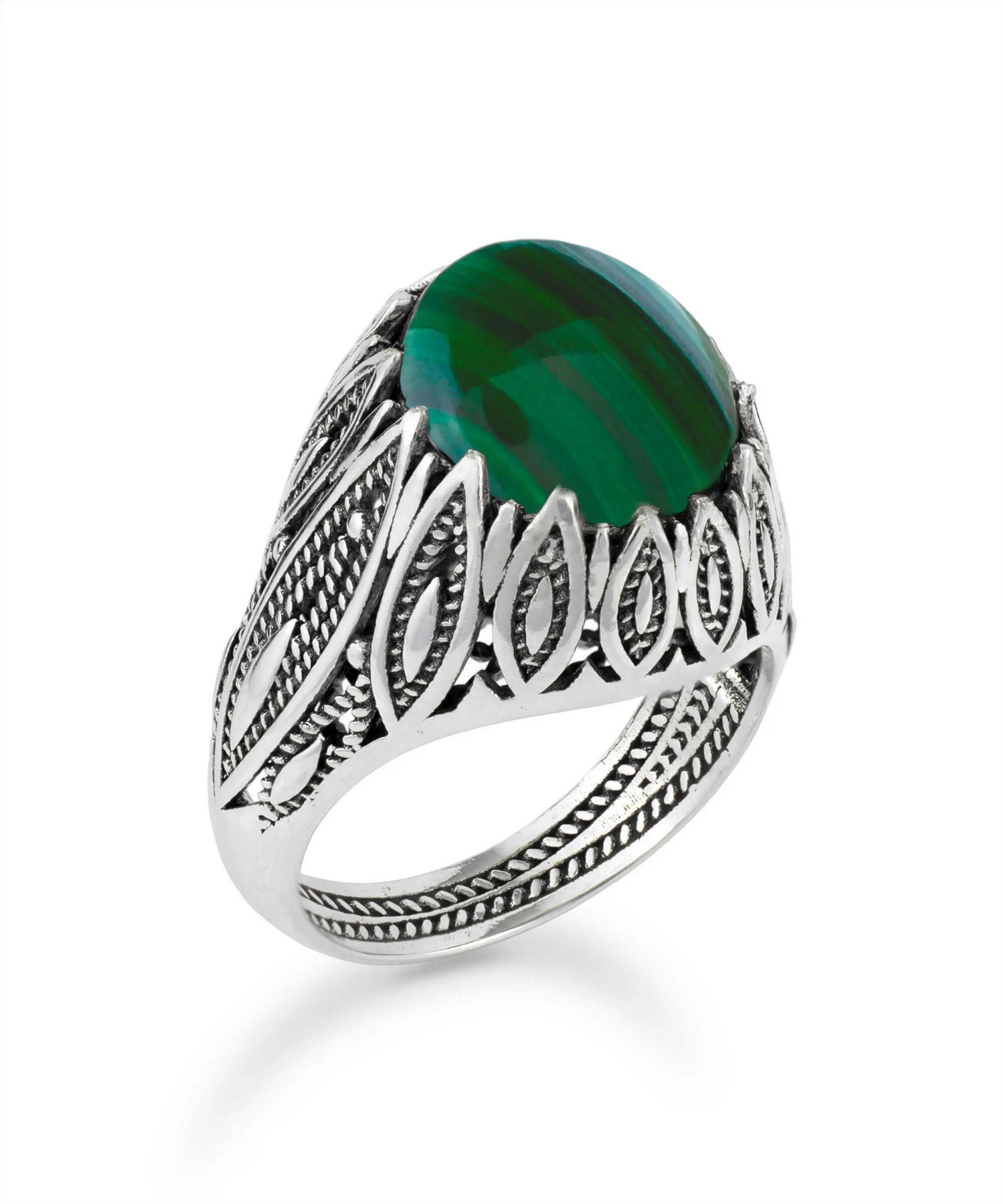 Filigree, composed of delicate metal strands skillfully fashioned, adds a unique touch to the exquisite craftsmanship of this Natural Malachite Gemstone Ring. Originating in Mesopotamia and Anatolia, this historical technique creates an outstanding combination of old and modern art.