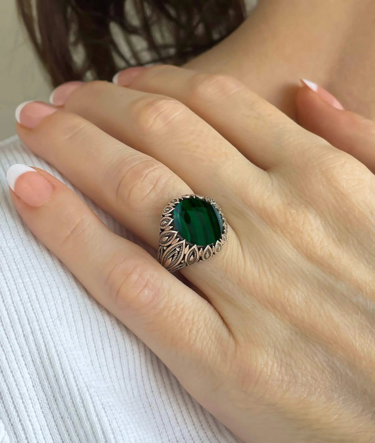 Indulge in Luxury with Our 925 Sterling Silver Filigree Art Natural Malachite Gemstone Women's Statement Ring