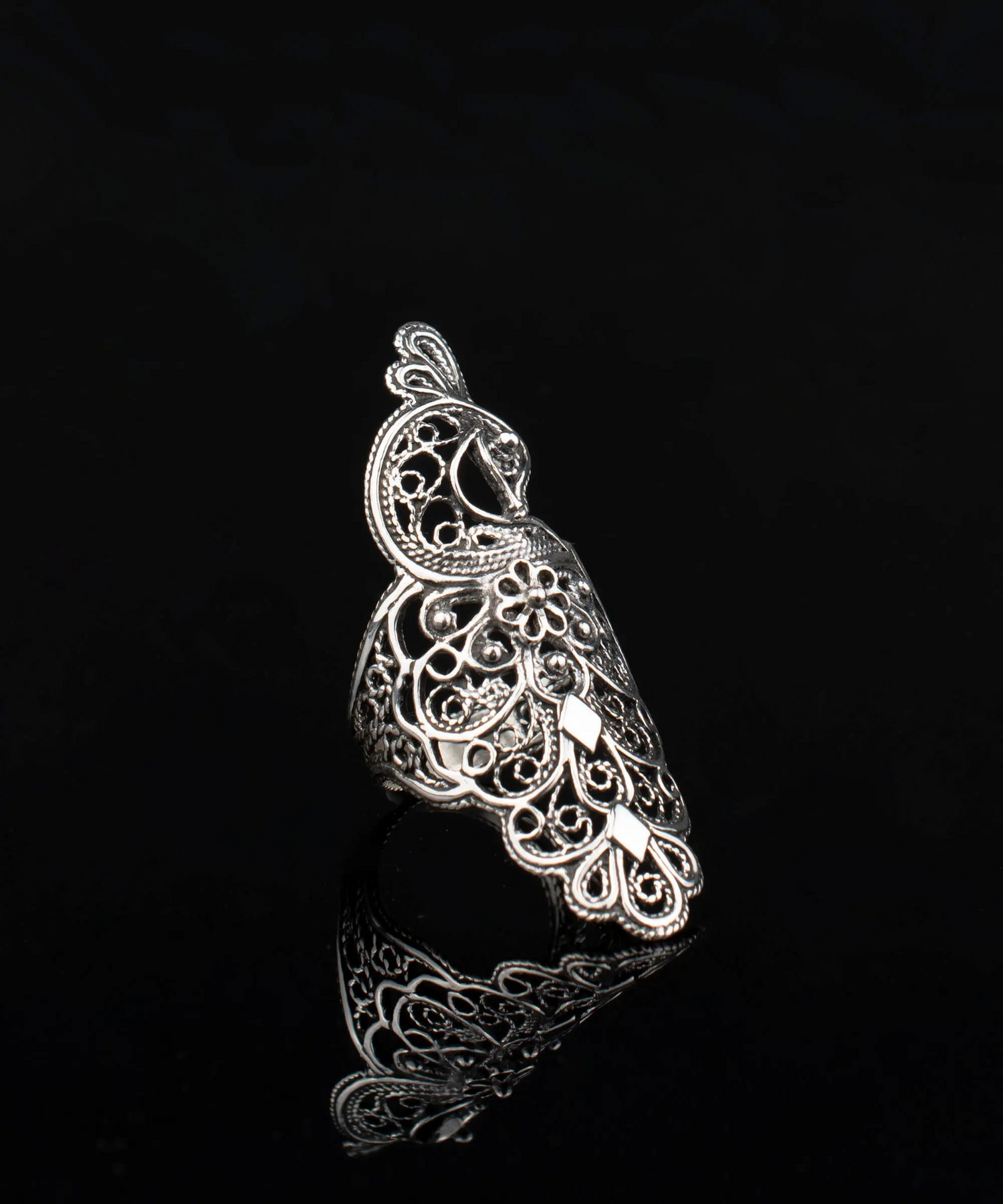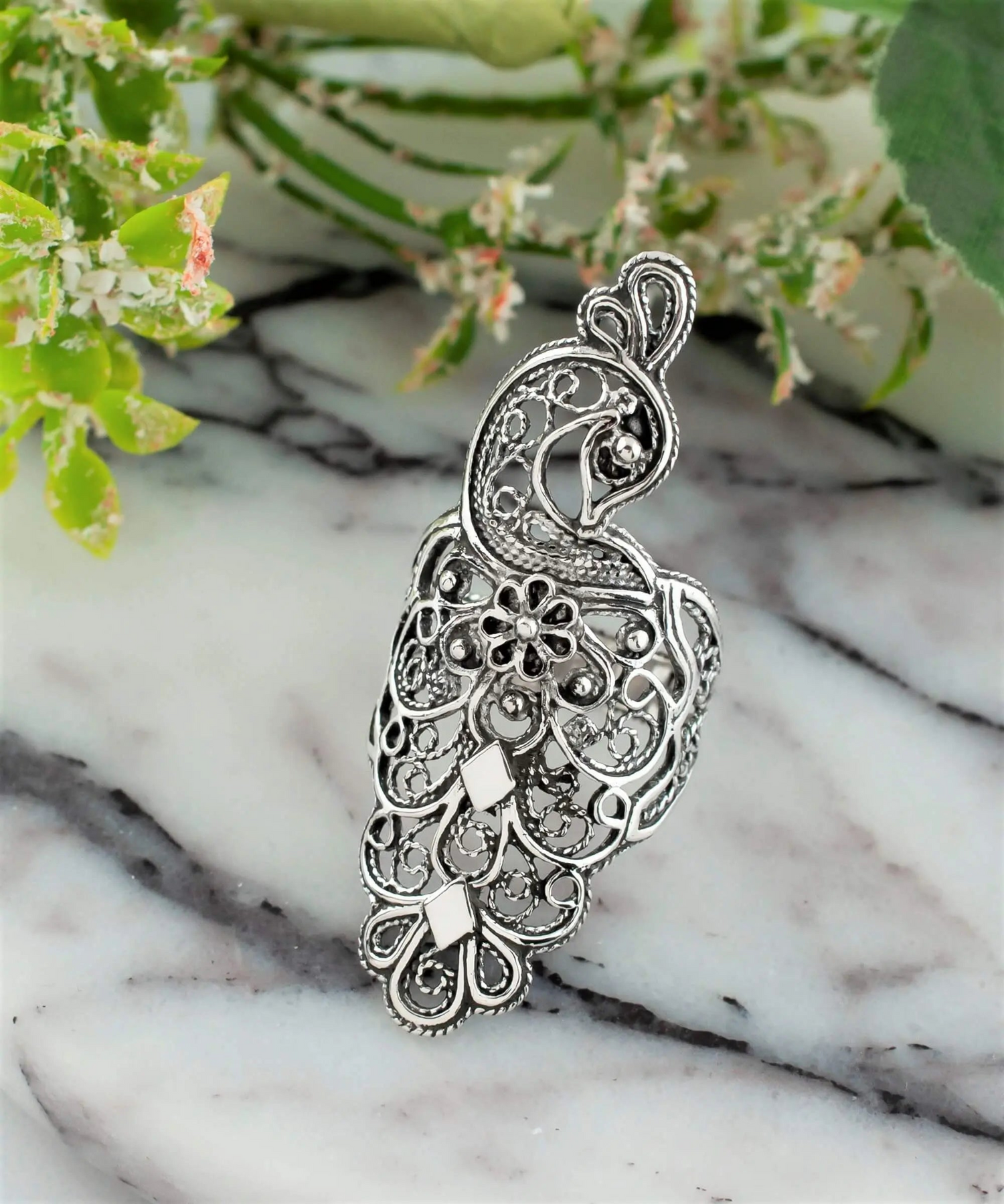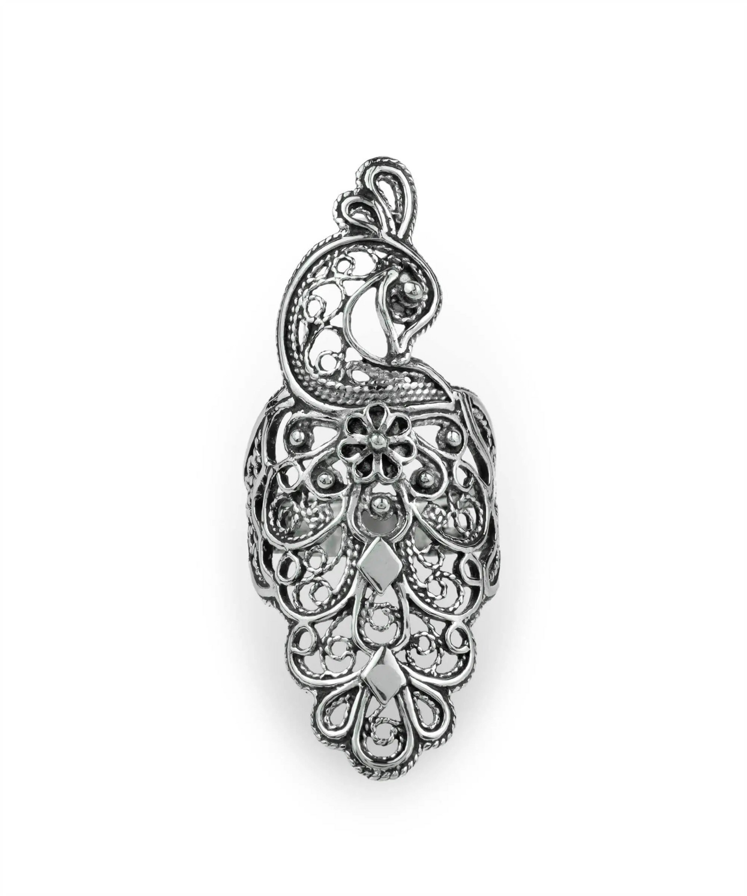 Elevate Your Style with the Filigree Art Peacock Design Sterling Silver Statement Ring