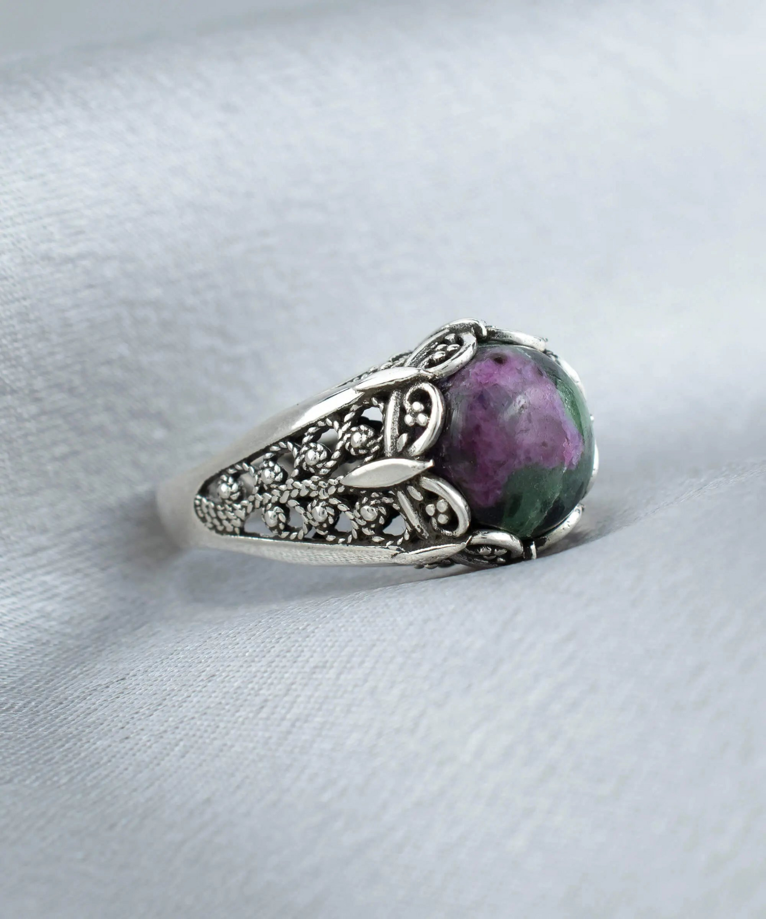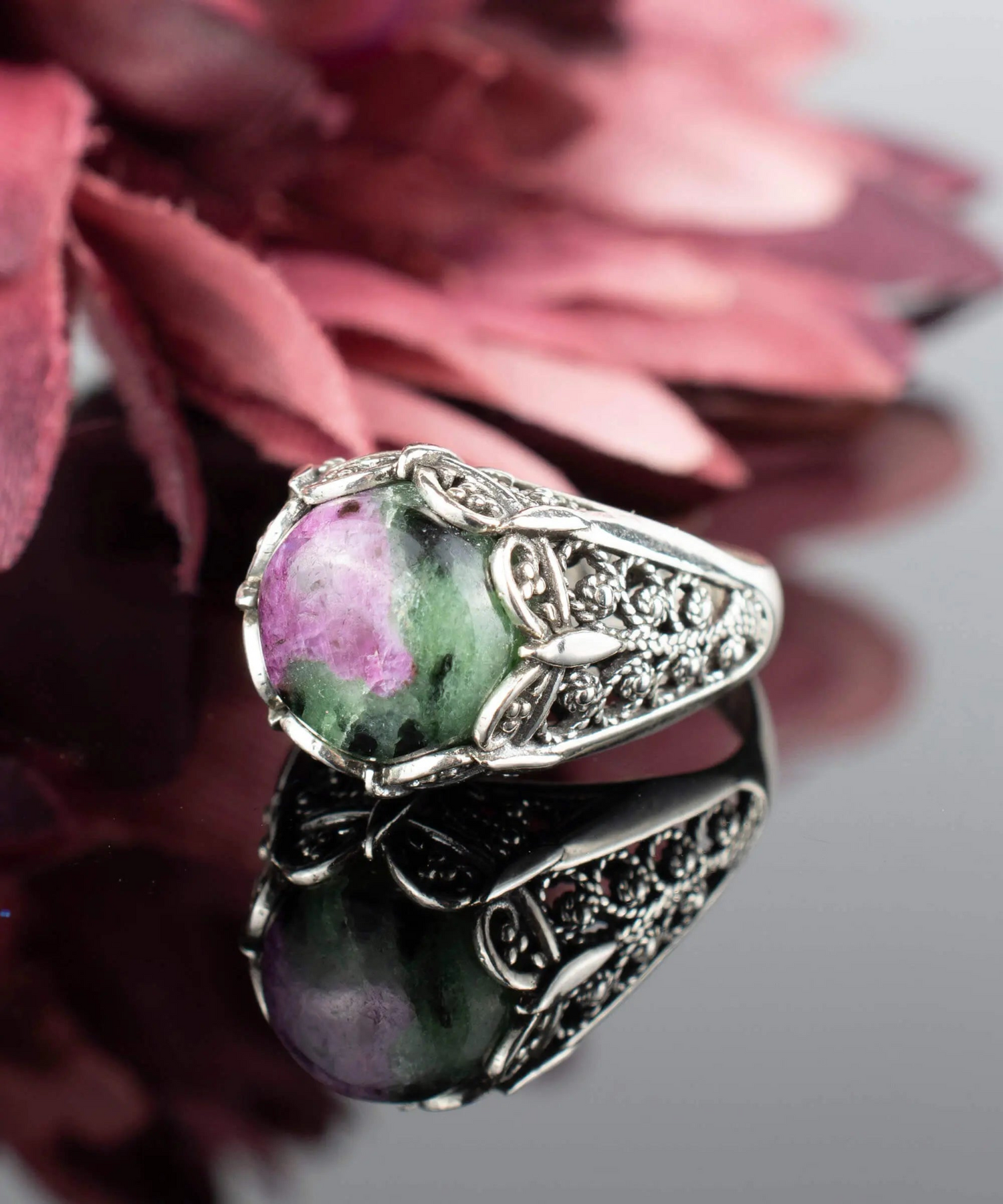 Elevate Your Style with the Handmade Filigree Art Ruby Zoisite Silver Cocktail Ring