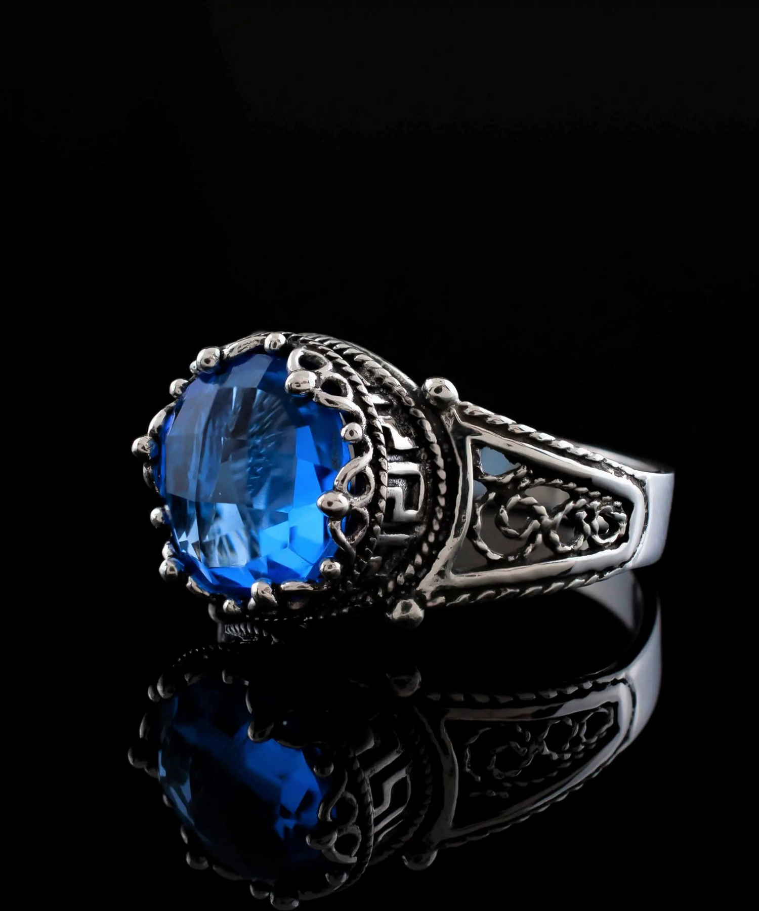 This stunning ring is crafted from 925 sterling silver in a delicate filigree art pattern, creating an intricate and eye-catching design. The centerpiece of the ring is a beautiful blue quartz gemstone, measuring 10mm in diameter and featuring a double side faceted, checkerboard round-cut. The stone is perfectly set within the 0.47" / 12.00mm ring face, adding a touch of elegance to the overall design.
