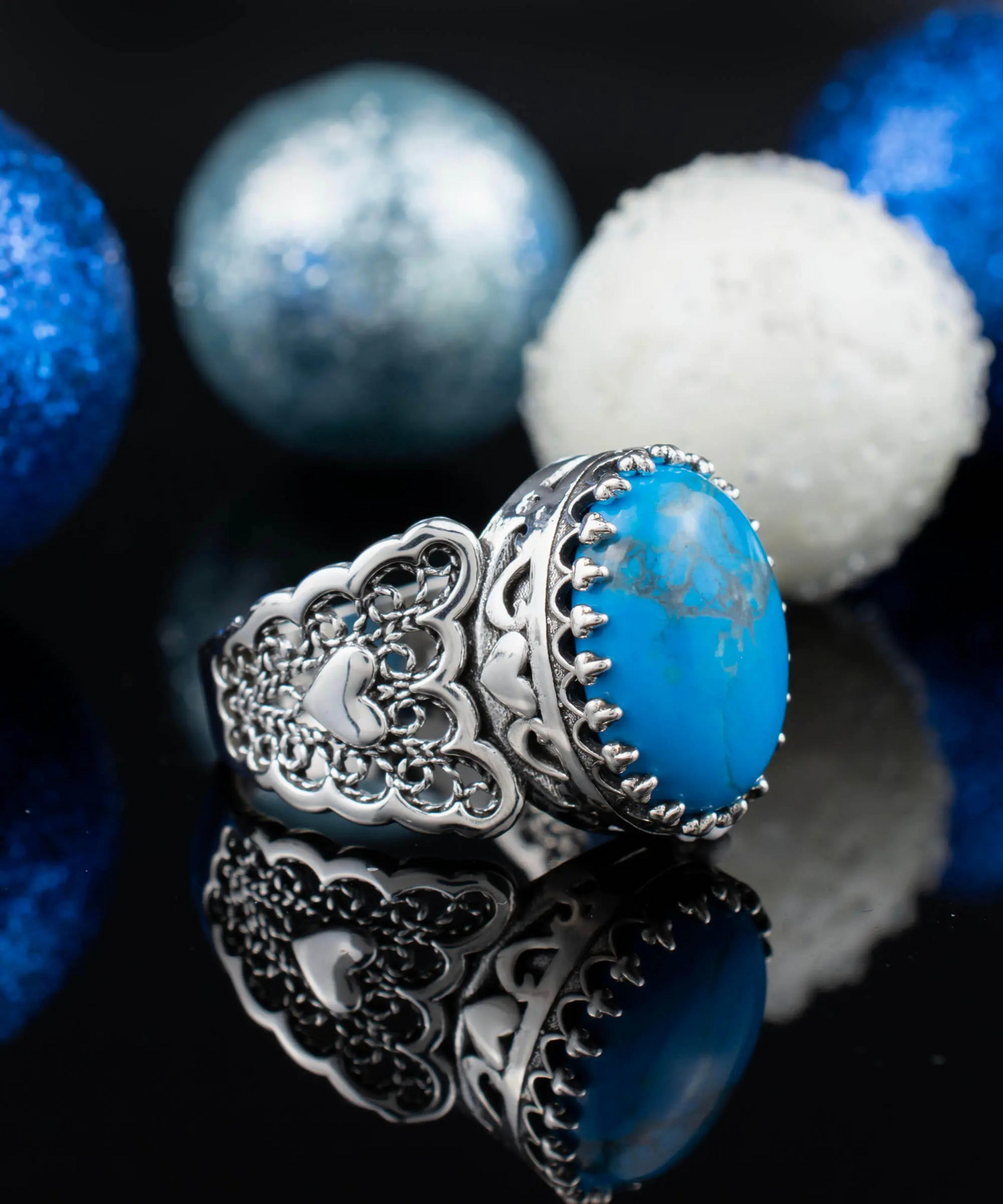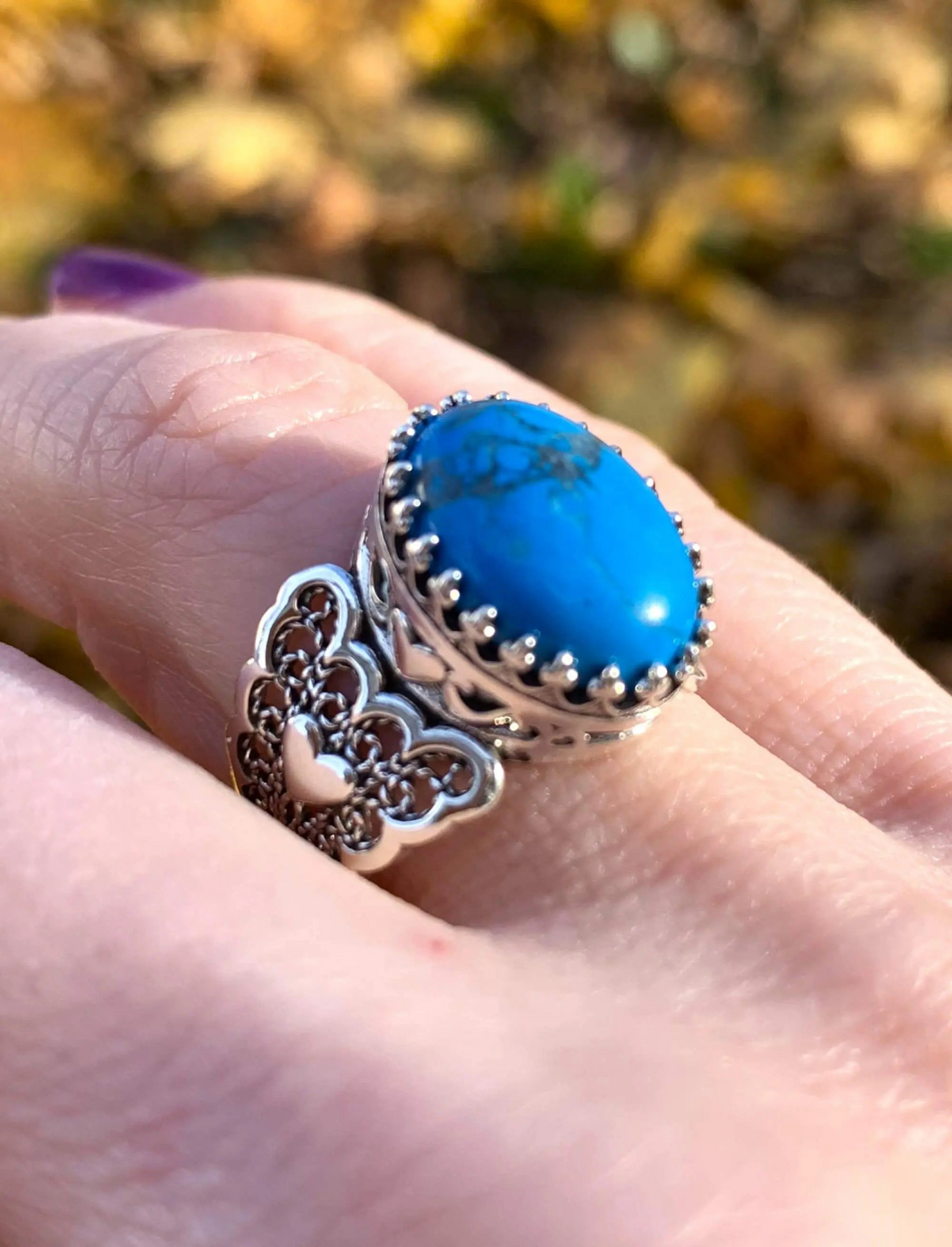 As an added bonus, this ring comes with a velvet pouch, a silver polish cloth, and a luxurious gift box, making it the perfect gift for yourself or a loved one. So why wait? Add our 925 Sterling Silver Filigree Art Double Heart Detailed Natural Turquoise Gemstone Women Statement Ring to your collection today and experience the elegance and beauty of natural gemstones!