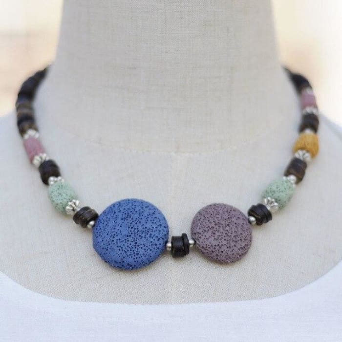 Elevate your style and enhance your well-being with the Blue and Byzantium Purple Lava Stone Essential Oils Necklace. Order yours today and experience the benefits of aromatherapy in a fashionable way.