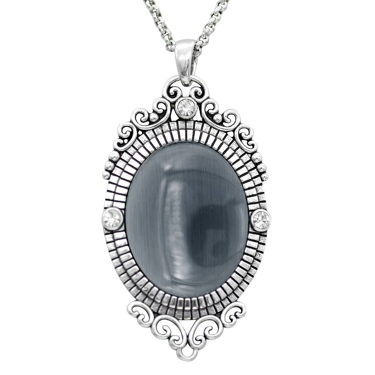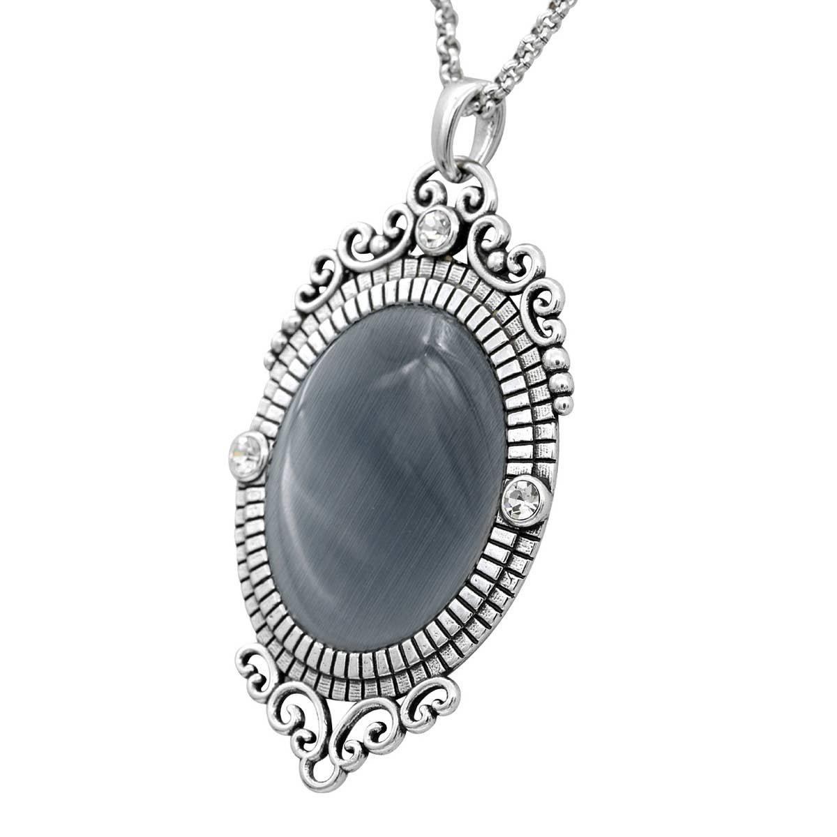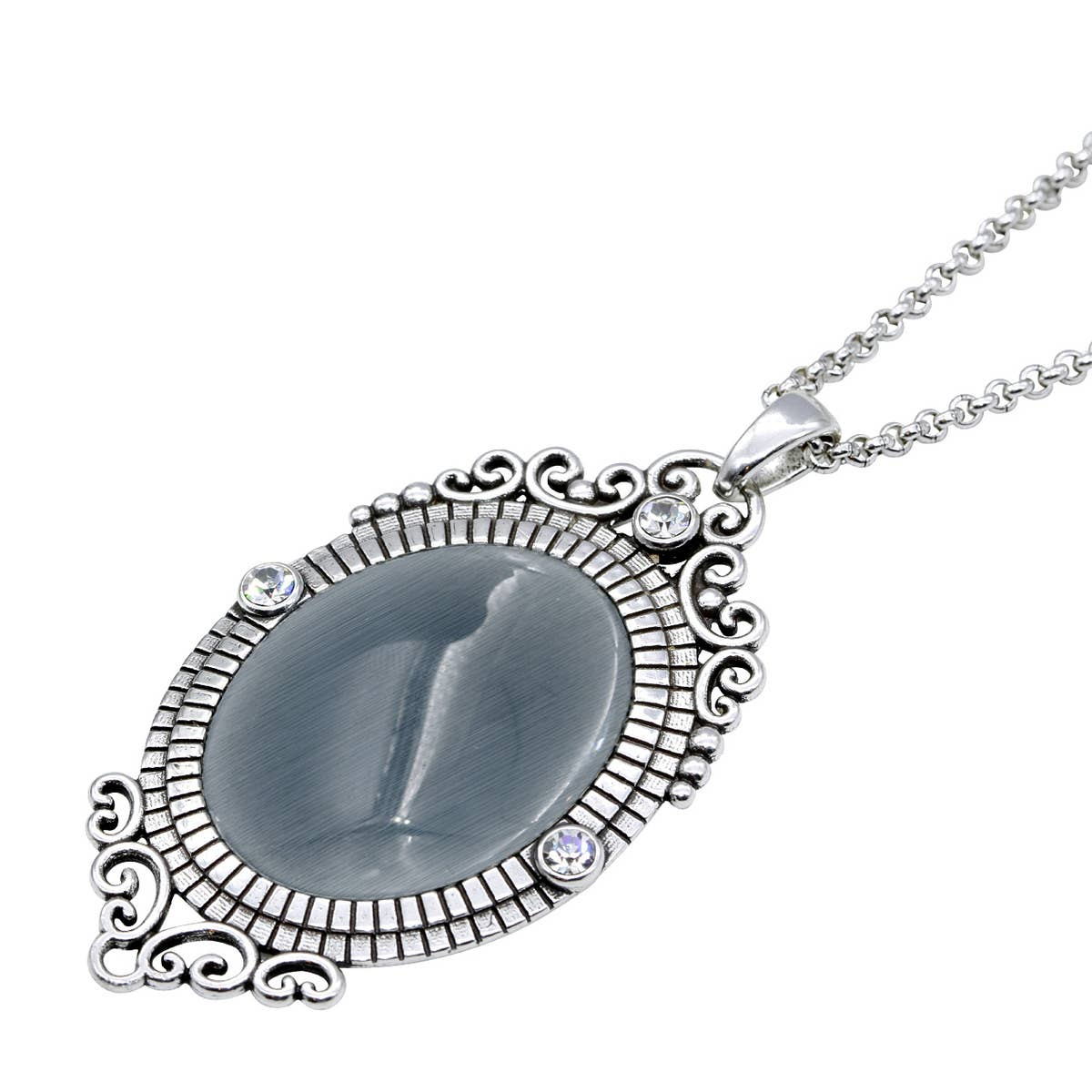 Indulge your artistic side with the Controse Silver Plated Baroque Cat's Eye Gemstone Necklace. Combining artistry and style, this necklace is a masterpiece that adds a touch of elegance to any outfit. Made of silver-plated stainless steel, this necklace features a stunning gray cat's eye gemstone encircled in an oval-shaped frame embellished with three white Swarovski crystals.