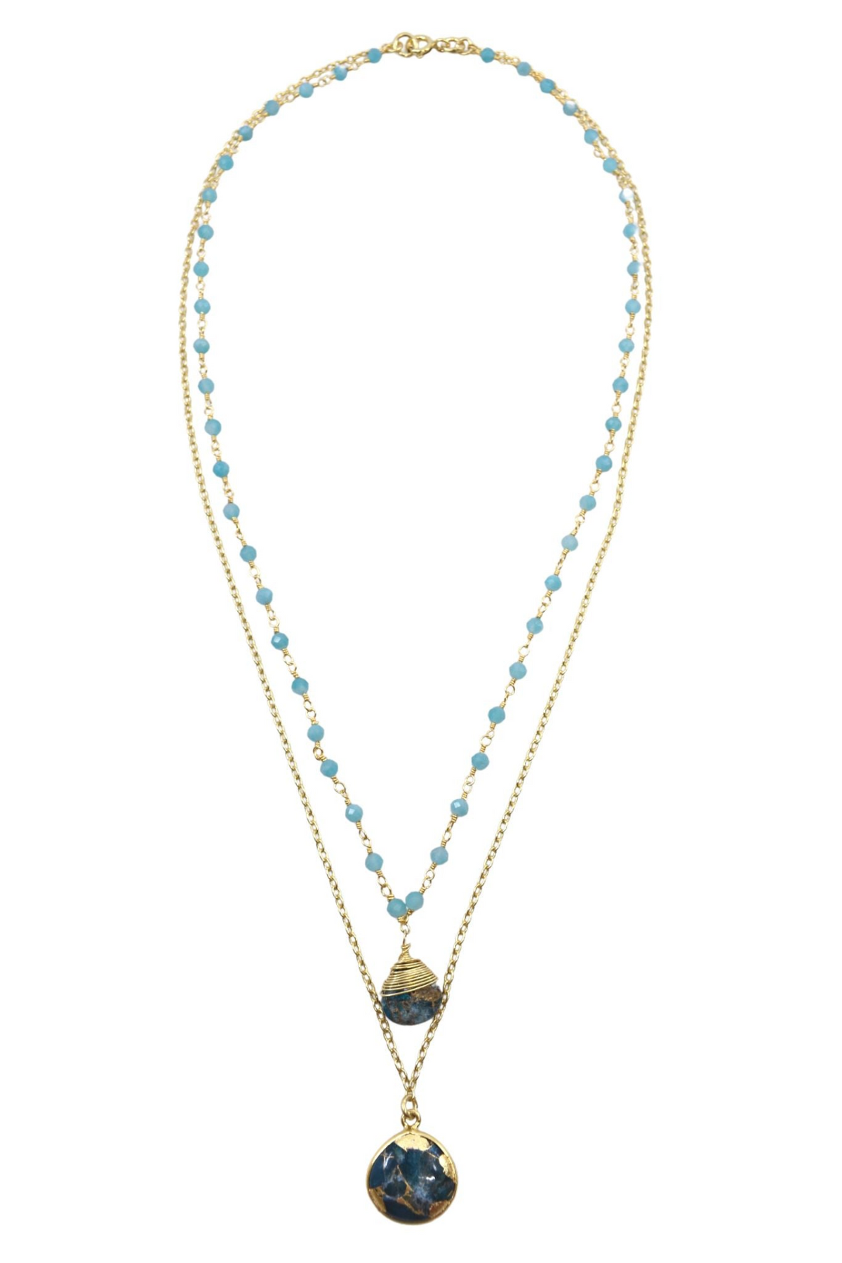 Chains: One strand features a classic vermeil chain, while the other showcases a hand-wrapped amazonite beaded chain.