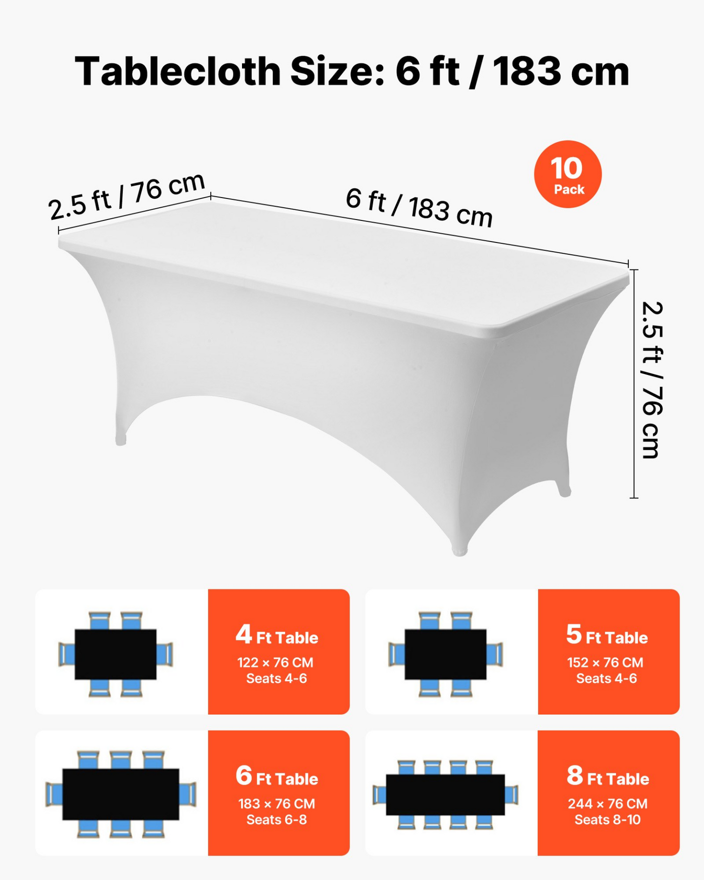 VEVOR 10 Pack Table Cloth for 6FT Rectangular Fitted Events, Wrinkle-Resistant Stretch White Table Covers, Washable Spandex Tablecloth Protector, for Party, Wedding, Cocktail, Banquet, Festival High Elasticity Precision Sewing Wrinkle-Resistant Easy to Maintain Elegant Choice for Friends Multiple Options Counts: 10 Pcs/Box,Item Model Number: RD-TB-25,Net Weight: 9.0 lbs / 4.1 kg,Product Size: 6 x 2.5 x 2.5 ft / 183 x 76 x 76 cm Specifications: - Length: 34.0 in, Width: 20.0 in, Height: 39.0 in