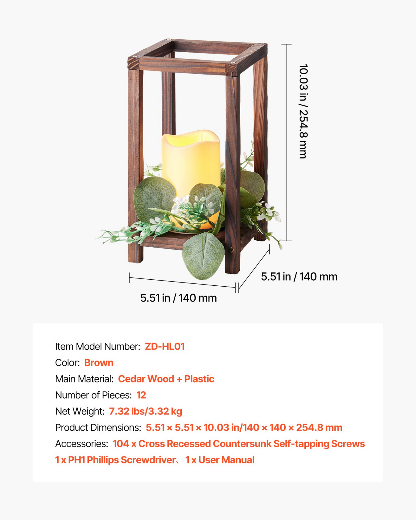VEVOR 12 Set/36 Pcs Wooden Wedding Lantern Centerpiece, Includes 12 Wooden Lantern Candle Holder 12 Flameless LED Candle 12 Eucalyptus Leaves Wreath for Wedding Table Party Farmhouse Decor, Brown Romantic Atmosphere Created Closer Conversations Stable Structure Easy Installation Wide Applications Secure & Flameless Number of Pieces (Set): 12,Color: Brown,Item Model Number: ZD-HL01,Product Dimensions: 5.51 x 5.51 x 10.03 in/140 x 140 x 254.8 mm,Net Weight: 7.32 lbs/3.32 kg,Main Material: Cedar Wood + Plastic Specifications: - Length: 31.7 in, Width: 42.2 in, Height: 21.1 in