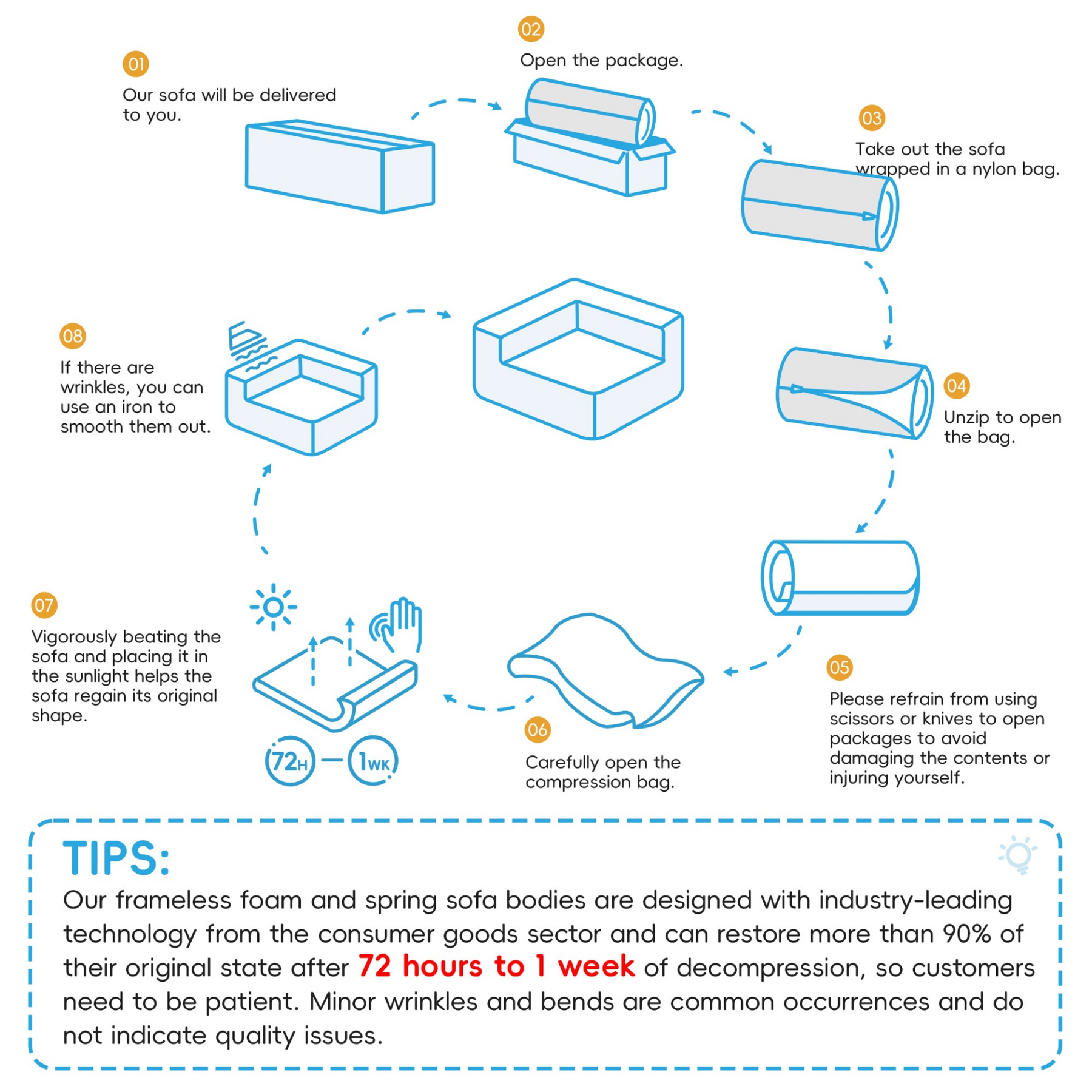 Fully Compressed for Easy Transport: This sectional sofa is fully compressed, allowing for easy movement and storage. It ships compactly, fitting effortlessly through narrow spaces like doorways and stairwells.