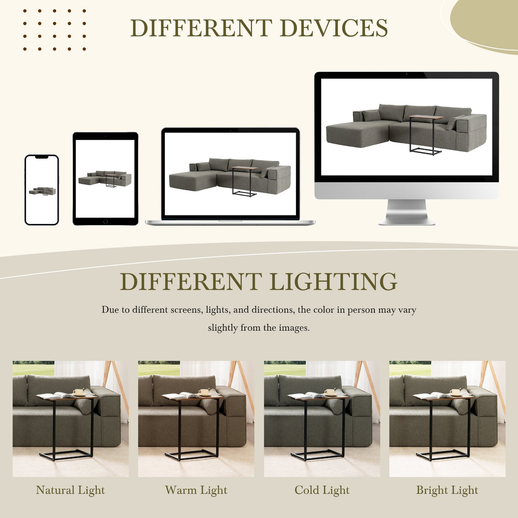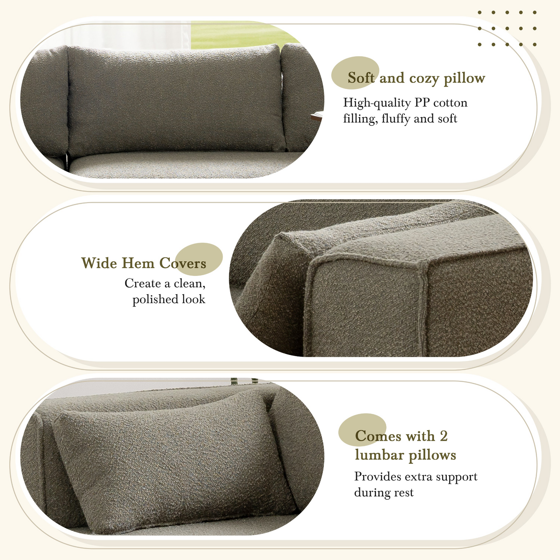 Boucle Fabric Upholstery: The wrinkle-resistant Boucle fabric is not only stylish but also durable and comfortable. Its texture and visual appeal make it a standout piece in any living room.